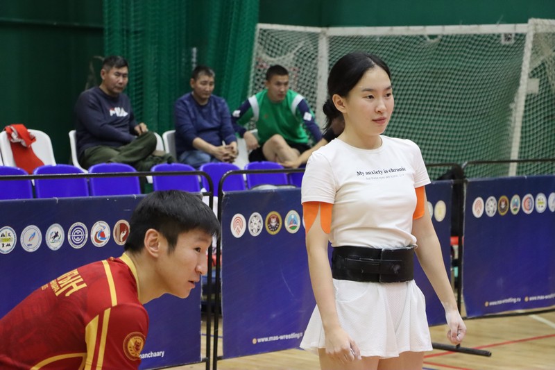 У девушек лидирует Марианна Кейметинова из Кобяйского улуса (7 очков). Она выиграла прыжки 3х3 (23 м 41 см), тутум эргиир (48 оборотов) и заняла пятое место в мас-рестлинге. На втором месте с 8 баллами мегинка Айаана Константинова – она выиграла мас-рестлинг и была в второй в прыжках. На третье место вышла Жанна Чалбанова из Сунтарского улуса с 9 очками.