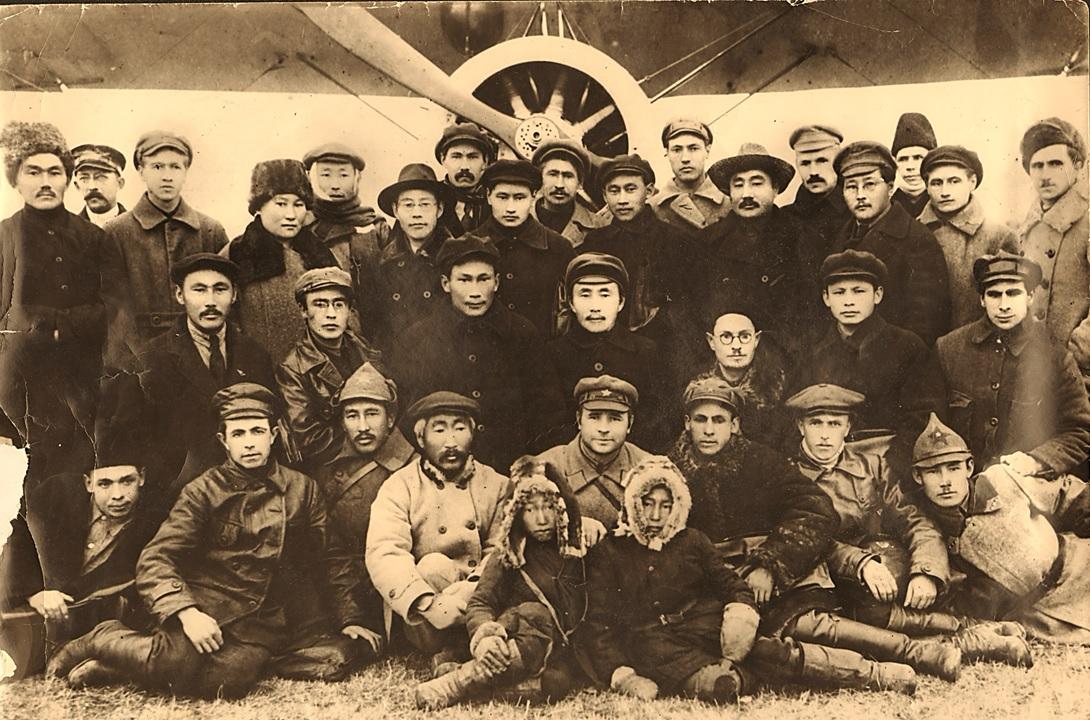 8 октября 1925 года. Сегодня 100 лет авиации Якутии. На фоне "Сопвича-Струтера" П. Ойунский, М. Аммосов, председатель плановой комиссии СНК Георгий Колесов, Р. Кардашевский, Н. Бубякин, А. Бояров, В. Леонтьев, лётный состав. Фото ЦА РС(Я).