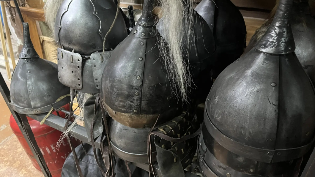– Мы сами для фильма «Тыгын Дархан» (2020 год). Это не железо, это пластик, перекрашенный под железо. Есть такой лист. Мы его разрезали на пластины, немного расплавили, размягчили и придали такую округлую форму. Очень капризный материал и кропотливая работа.