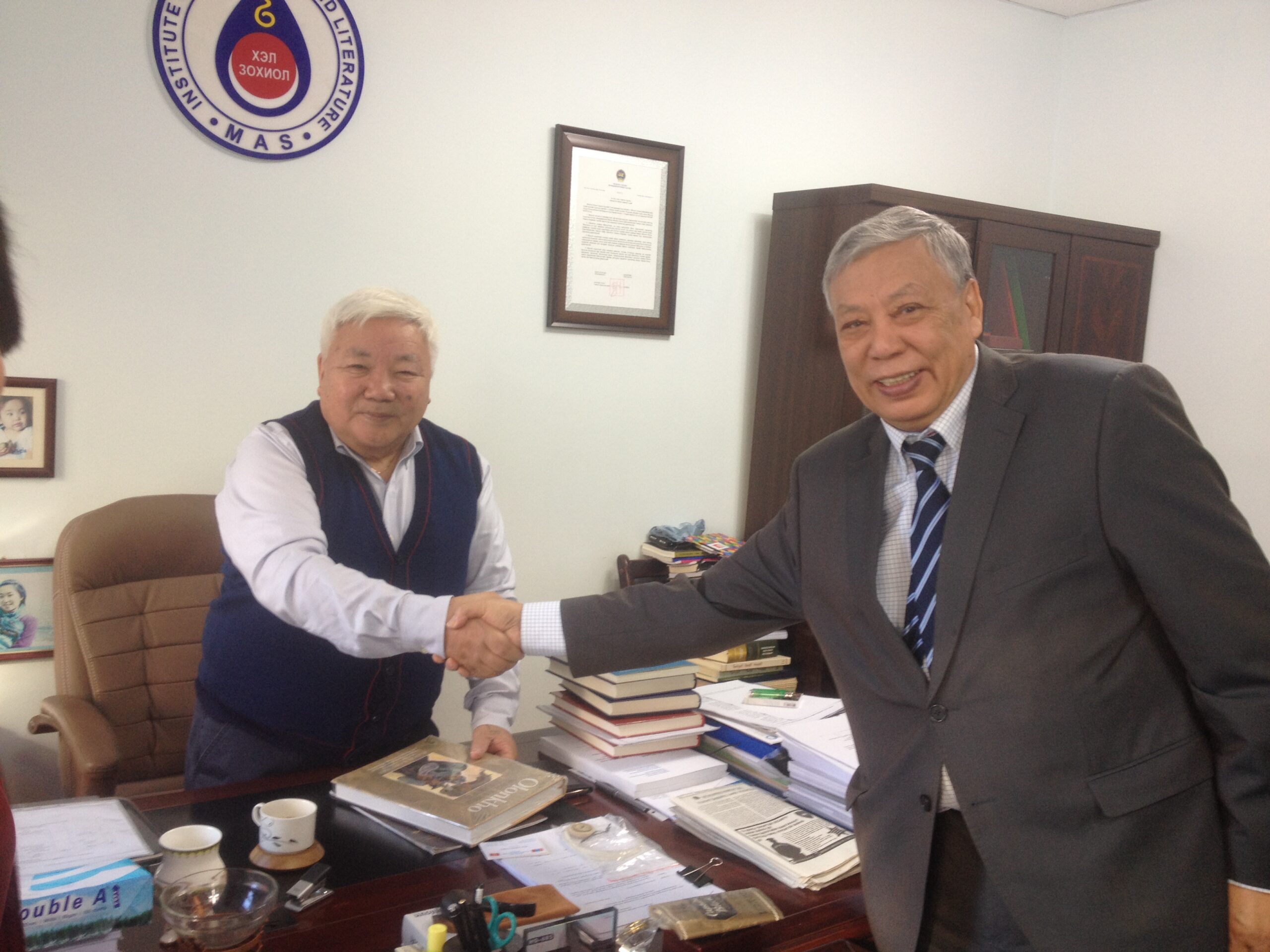Во время поездки состоялось немало продуктивных встреч и разговоров с монгольскими коллегами. На первой же встрече в Институте языка и литературы Академии наук Монголии нас тепло приветствовал его директор, выдающийся специалист по тюрко-монгольским языковым контактам, академик Лувсандоржийн Болд.