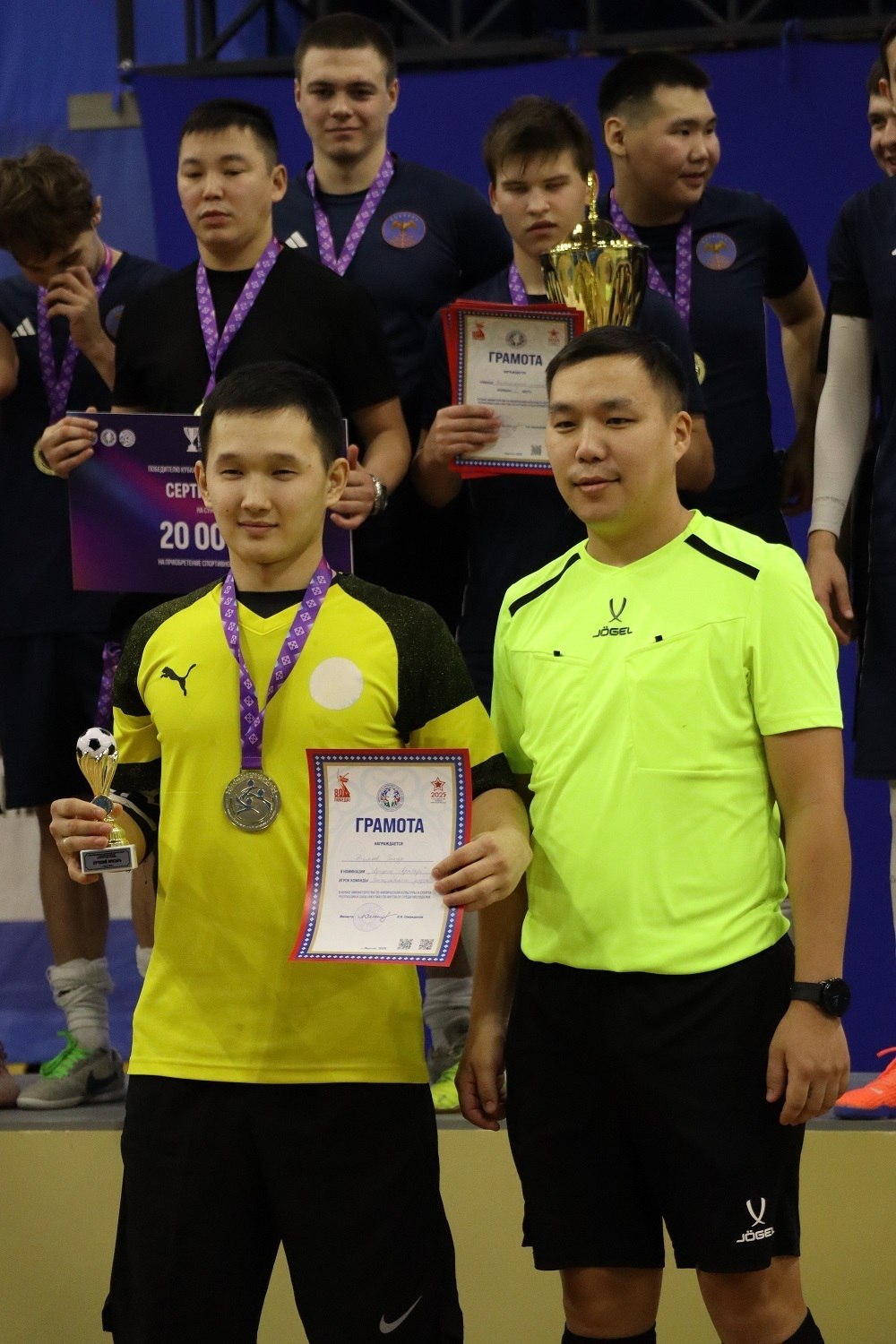 Также лучшими в своих амплуа названы: защитник – Никита Гомзяков (ЯПК), нападающий – Айкар Мучин (СВФУ). Больше всех мячей забил Алексей Захаров из команды ЯПК. Лучшим игроком турнира признан Данил Марсунов (Хангаласский улус), сын ветерана СВО и многолетнего игрока команды «Цементник» (Мохсоголлох) Игоря Марсунова.