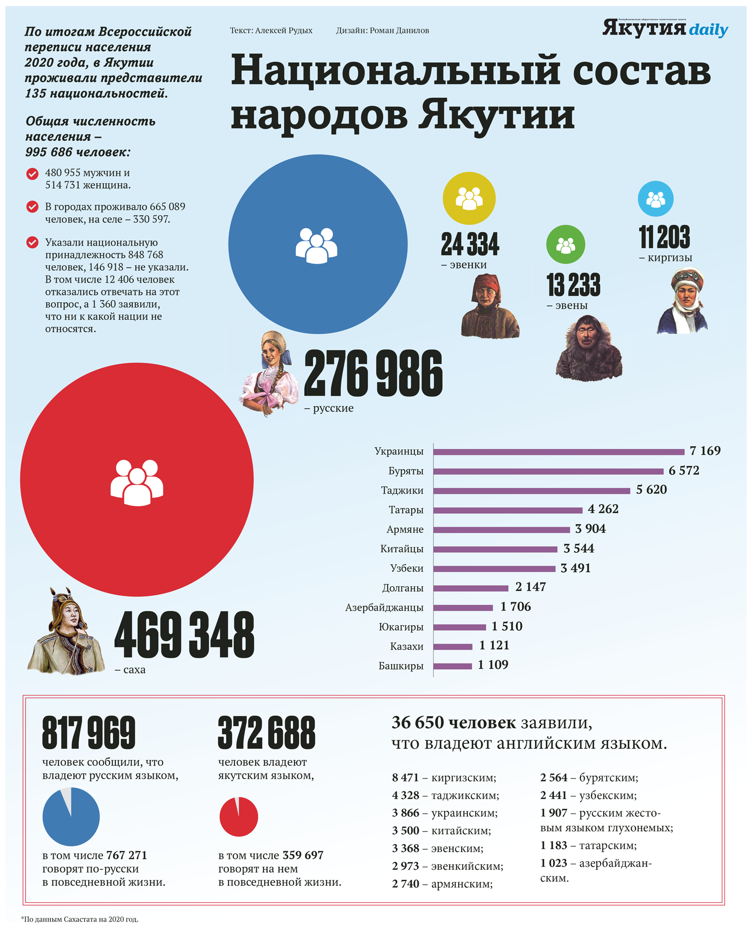 По итогам Всероссийской переписи населения 2020 года, в Якутии насчитывались представители 135 национальностей. Общая численность жителей — 995 686 человек: 480 955 мужчин и 514 731 женщина. В городах жили 665089 человек, на селе – 330 597. Указали национальную принадлежность 848 768 человек, 146 918 – не указали. В том числе, 12406 человек отказались отвечать на этот вопрос, а 1360 заявили, что ни к какой нации не относятся.