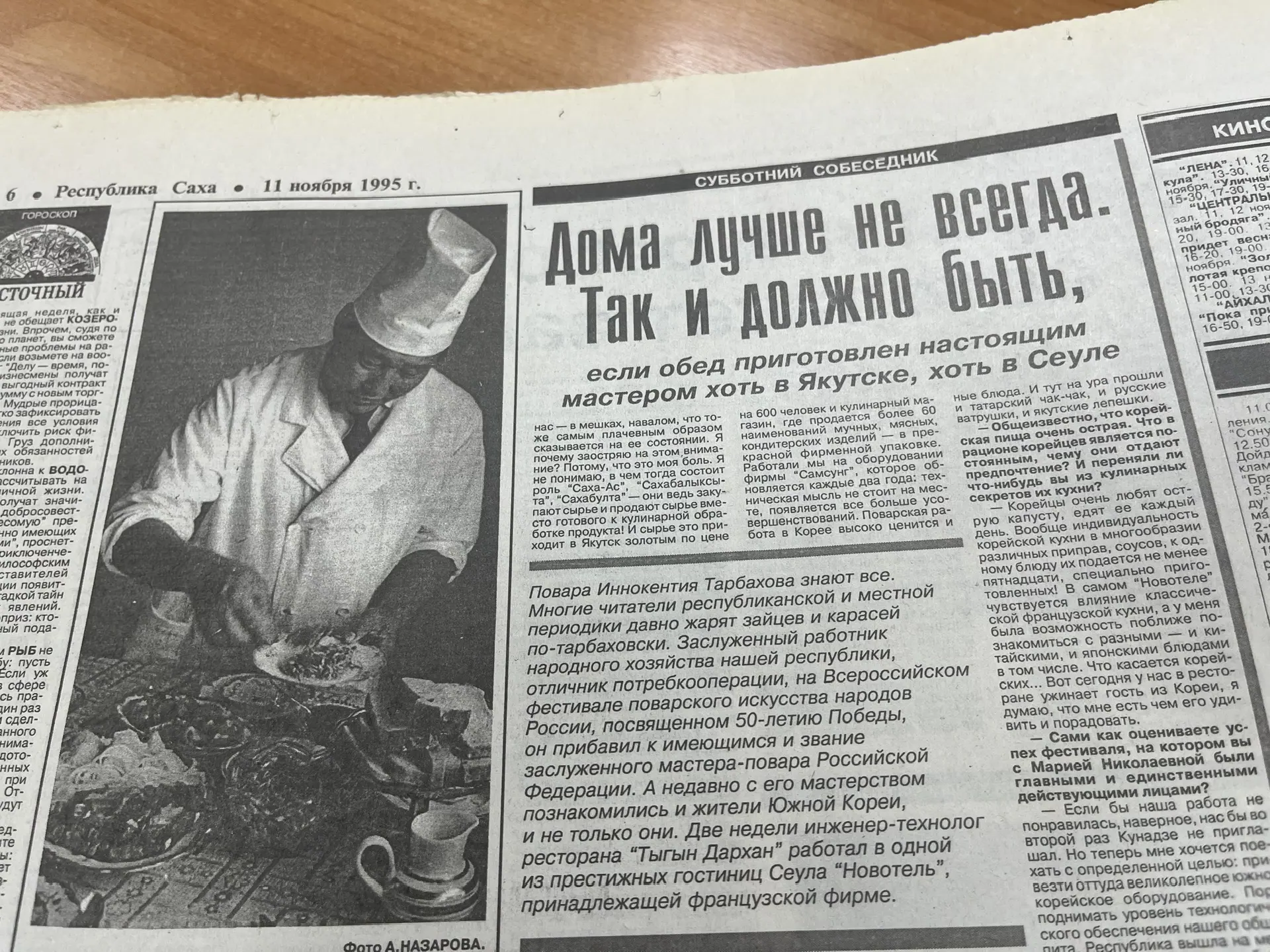 Продолжаем нашу серию публикаций старых статей из газеты. И сегодня у нас интервью с мэтром якутской кухни Иннокентием Тарбаховым, вышедшее в газете «Республика Саха» 11 ноября 1995 года. Ему тогда был 51 год, и он только-только вернулся из Сеула, где представил корейцам русскую кухню.