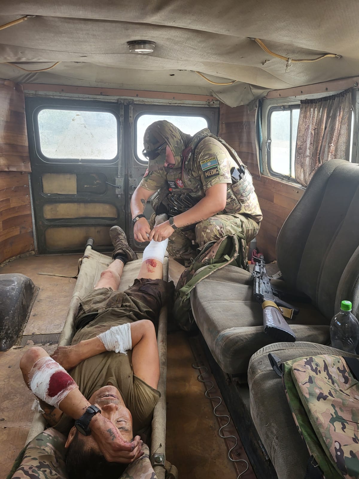 Недавно он получил ранения, лежал в госпиталях, сейчас проходит реабилитацию в Якутске. На груди у него две медали – «За боевые отличия» и «За спасение погибавших». Там, на переднем крае, Азамат Иванович был сначала водителем, а после санитаром. На его счету десятки парней, которых он вытащил на своей спине, носилках, тележках из самого пекла боёв.