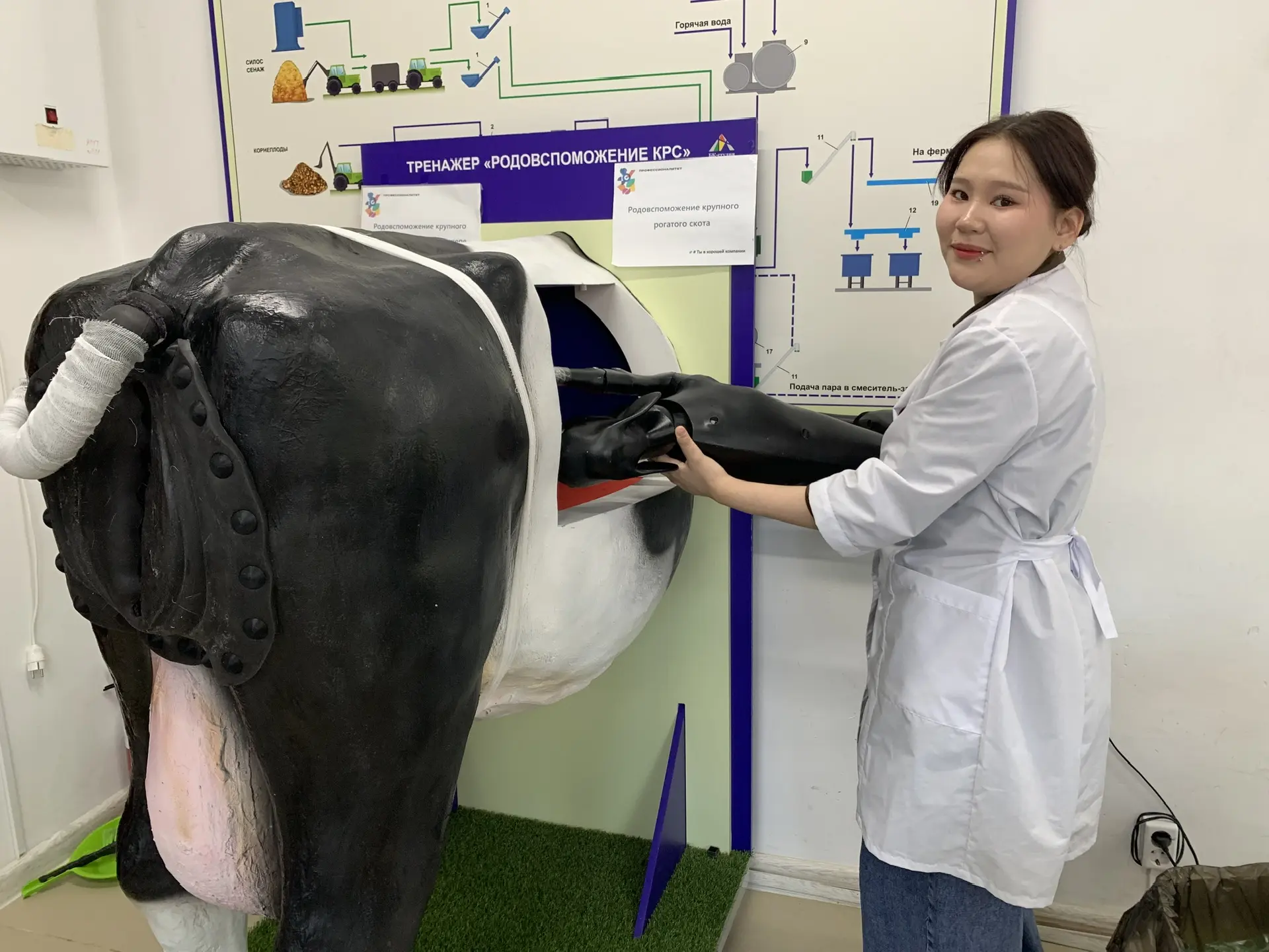 Нам разрешили заглянуть в аудитории, где шла подготовка к соревнованиям. На тренажере коровы в натуральную величину участники чемпионата должны были выполнить задания по родовспоможению КРС, проще говоря – помочь родить корове.