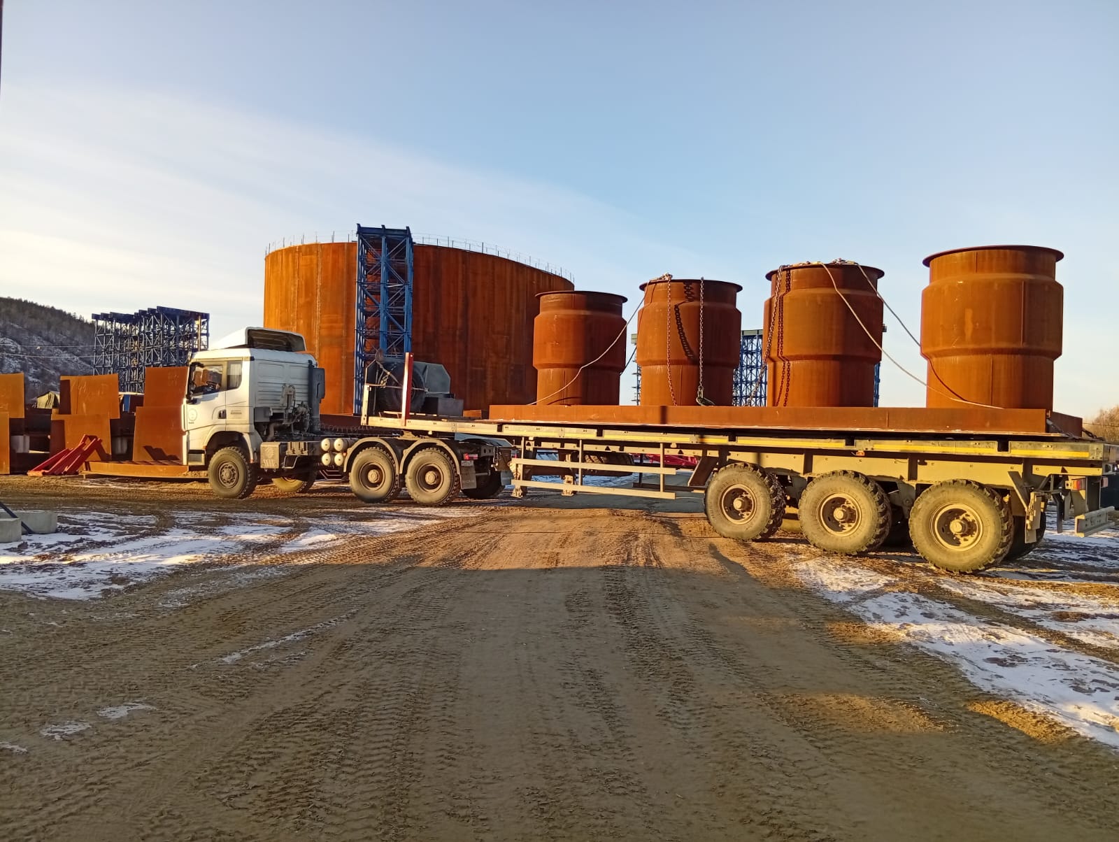 Технология наплавных коффердамов используется в России впервые. Как я уже говорил, с виду это здоровенные бочки из толстой сварной стали высотой свыше 17 м и диаметром 36-46 м. Внутри них массивные трубы, через которые будут проводиться бурение, заливаться бетон и т.д.
