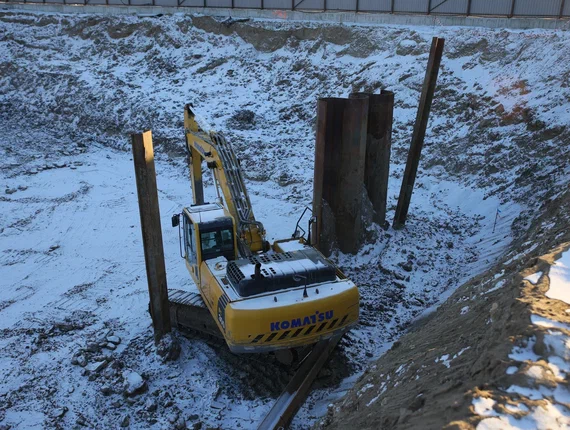 Чтобы показать, как идёт стройка, Крупнов ведёт меня к месту, где вырастут опоры №5 и №6. Место пятой опоры – это глубокий котлован ниже уровня реки. На дне внушительной ямы шумно работает экскаватор.