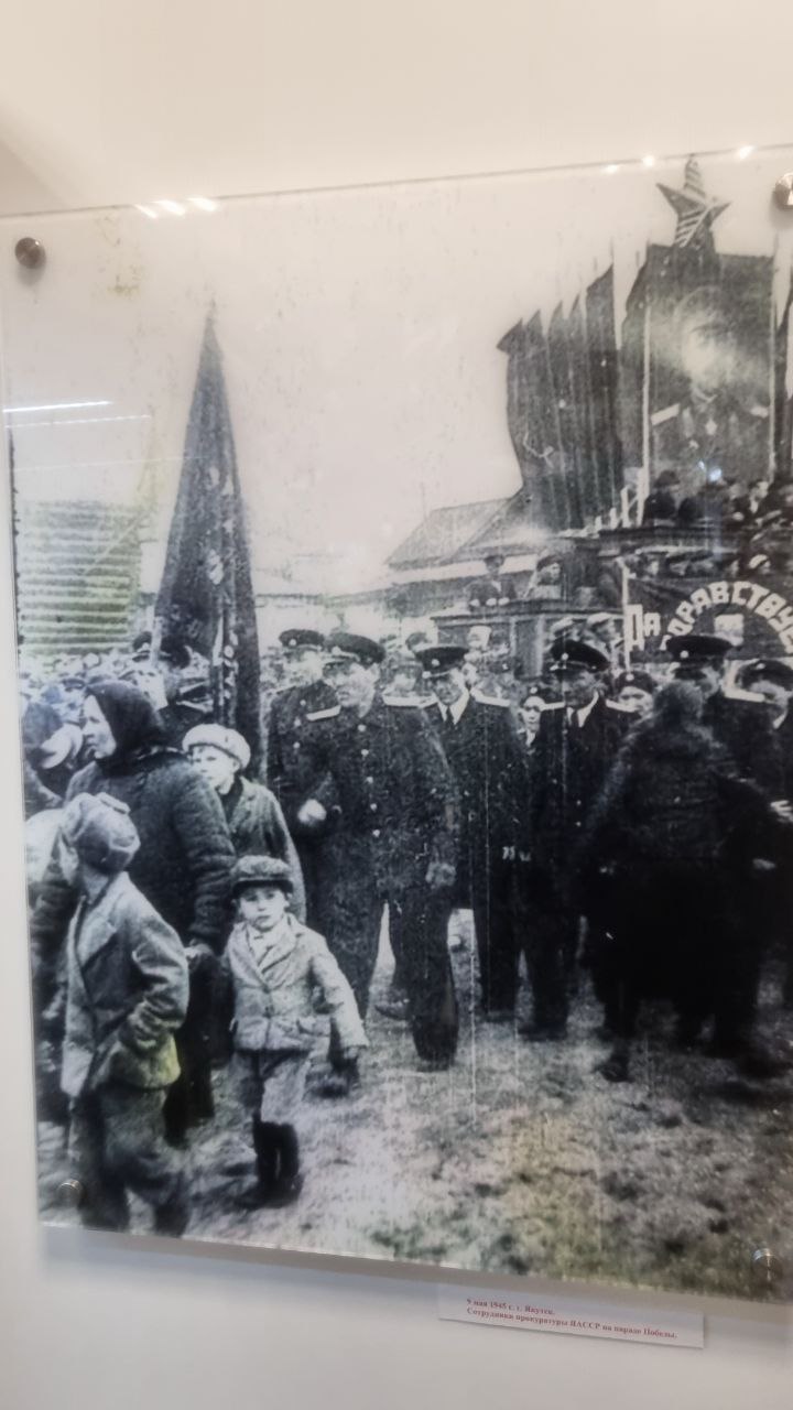 На выставке можно увидеть уникальное фото с парада 9 мая 1945 года в Якутске. В номере «Социалистической Якутии» от того дня есть описание парада и интервью на развороте, однако самой фотографии в издании не было — её недавно прислали из Москвы.