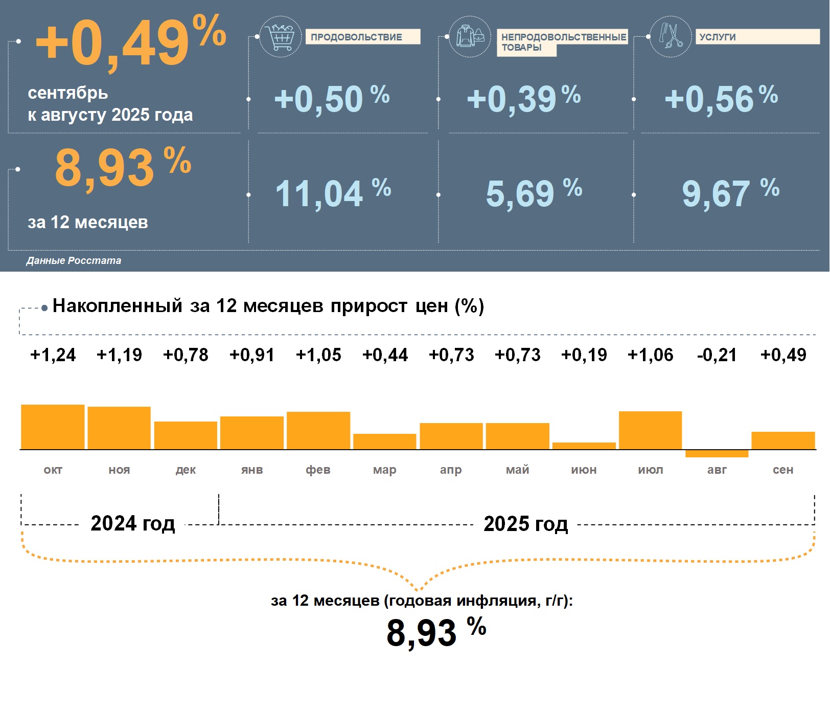 Цены в нашем регионе в сентябре 2025 года, по данным Росстата, на которые опирается Банк России, увеличились на 0,49% по сравнению с августом. Годовая инфляция ускорилась и составила 8,93%. Это больше, чем в целом по стране (7,98%). Впрочем, инфляция в нашей республике традиционно выше, чем в среднем по России и уступает разве что нескольким регионам ДВФО.