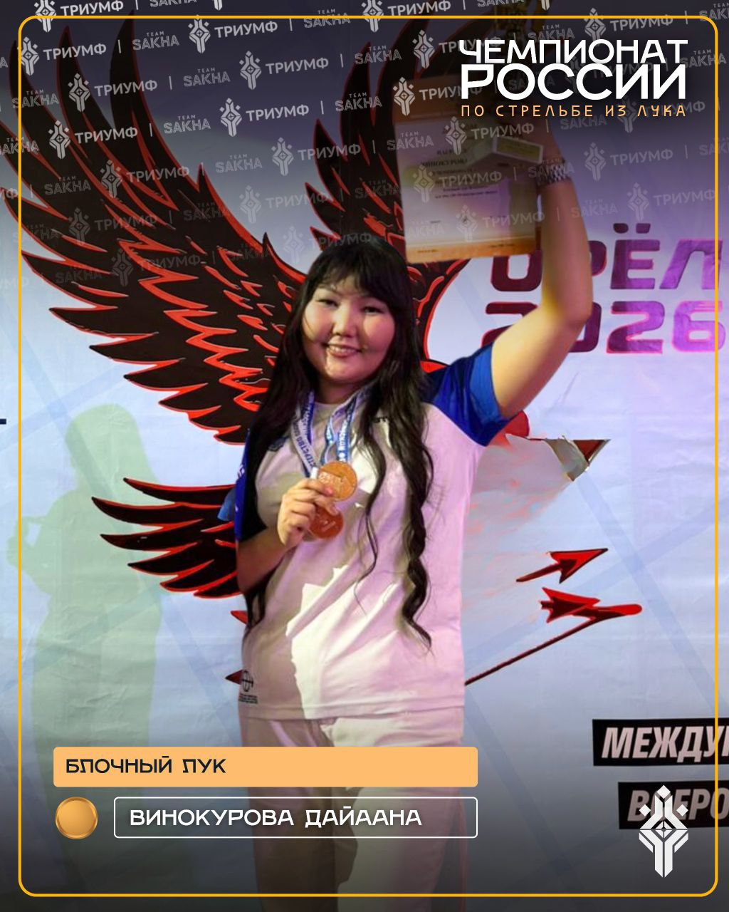 Ранее, 2 февраля, Дайаана Винокурова завоевала бронзовую медаль чемпионата России в стрельбе из блочного лука. В поединке за третье место она победила Елизавету Боброву со счётом 147:143 по итогам пяти серий. В решающей части финала Винокурова трижды поразила «десятку» в последних трёх выстрелах.