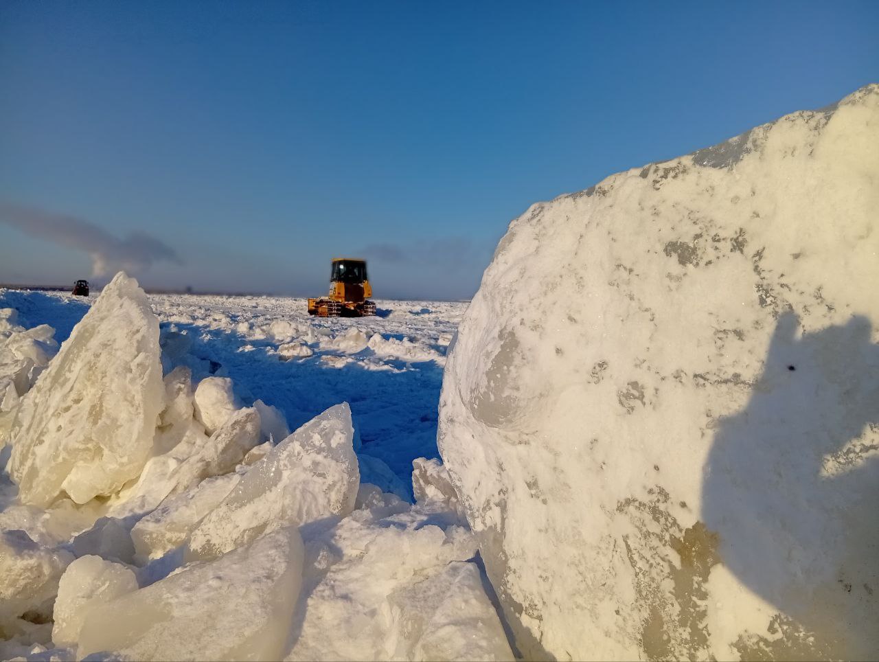На реке работают два бульдозера с отвалами, два колёсных трактора с отвалами и два с бурами и помпами, четыре колёсных трактора. Бригады идут со стороны Якутска к Нижнему Бестяху. Параллельно для набора толщины льда идёт проливка трассы.
