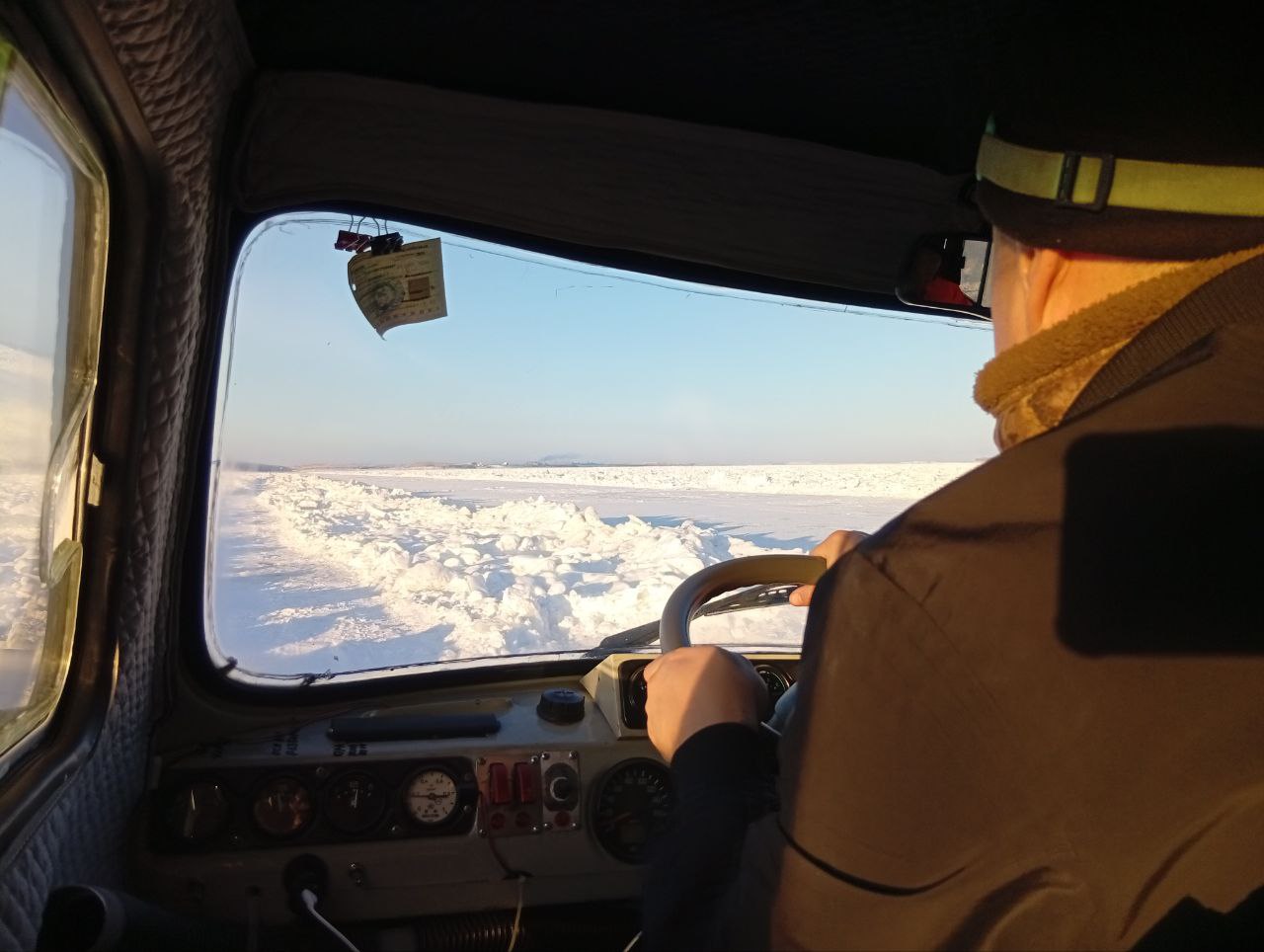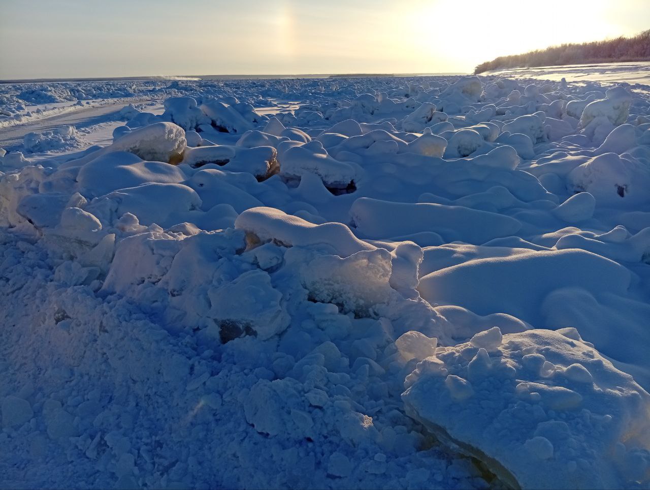 Тяжёлые участки у нас по фарватеру ниже острова, на сильных течениях и по перекатам там, где поздней осенью проходит паром с ледоколом. Они набивают лёд, и после них вырастает самая сложная для пробивки стена торосов порой высотой и до двух метров. И всё это надо разбить. Такое поле торосов не пройдёшь в лоб даже на тяжёлой технике. Бьёшь по бокам. Последний ледокол прошёл в ноябре, когда дорожники уже начали пробивать дорогу. После него пришлось начинать снова…