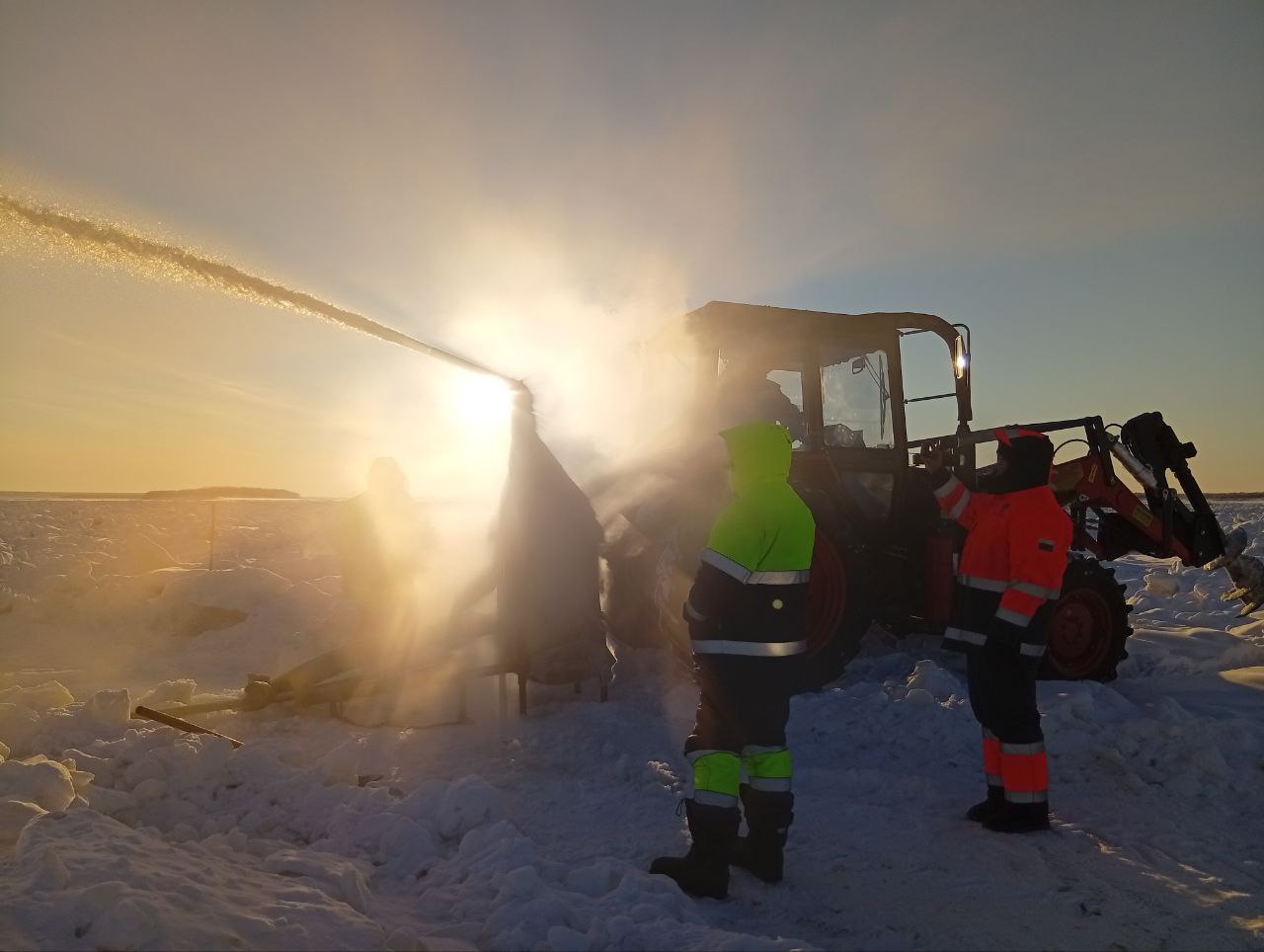 На островах работает отдельная водовозка. Песок на островах рыхлый, при устройстве зимника его надо основательно пролить водой, чтобы образовалась надёжная твёрдая корка.