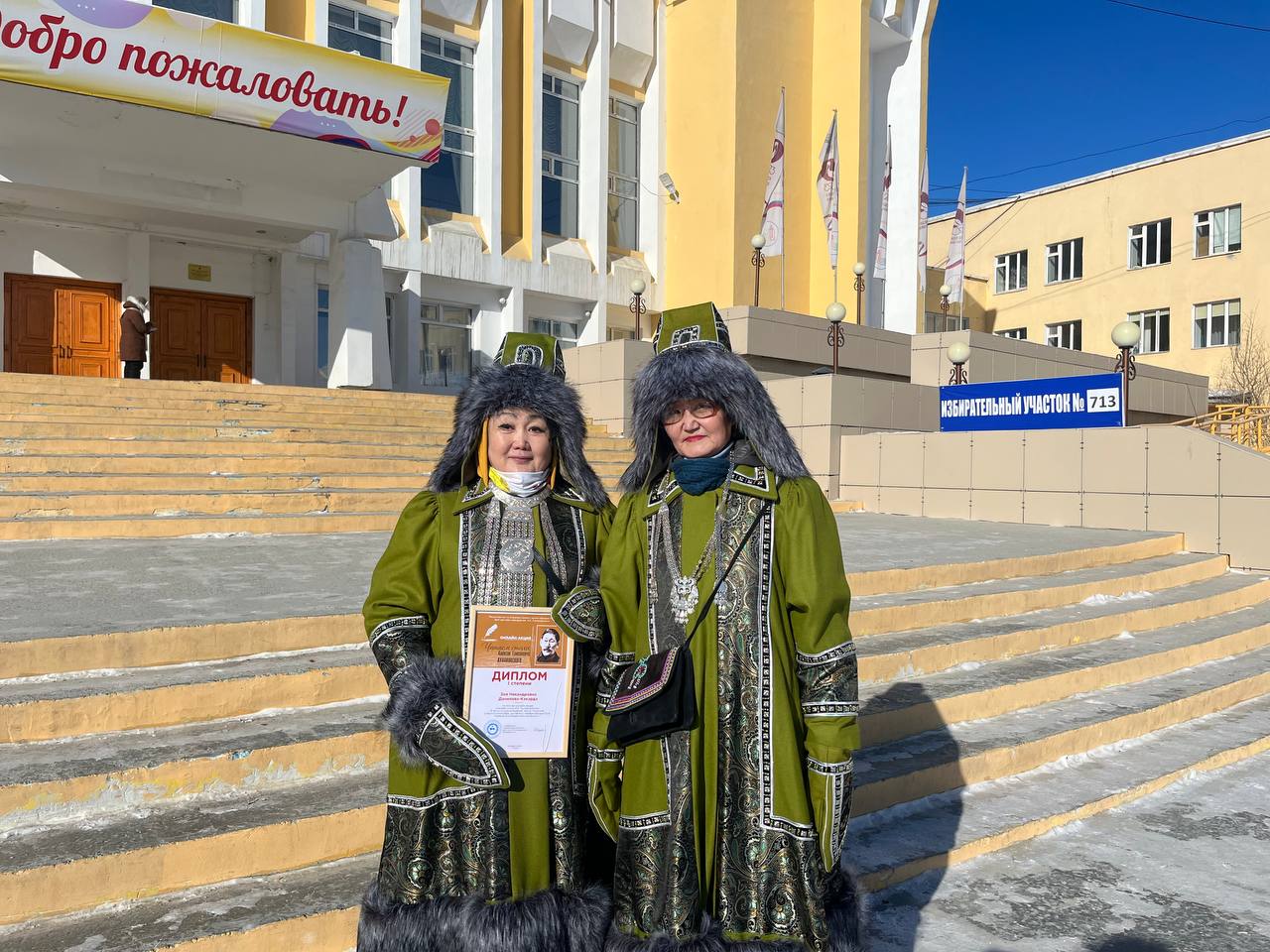 Зоя Данилова и Саргылана Феоктистова пришли на выборы в одинаковых национальных костюмах. Это зимний вариант, и они прямо так пришли на выборный участок.