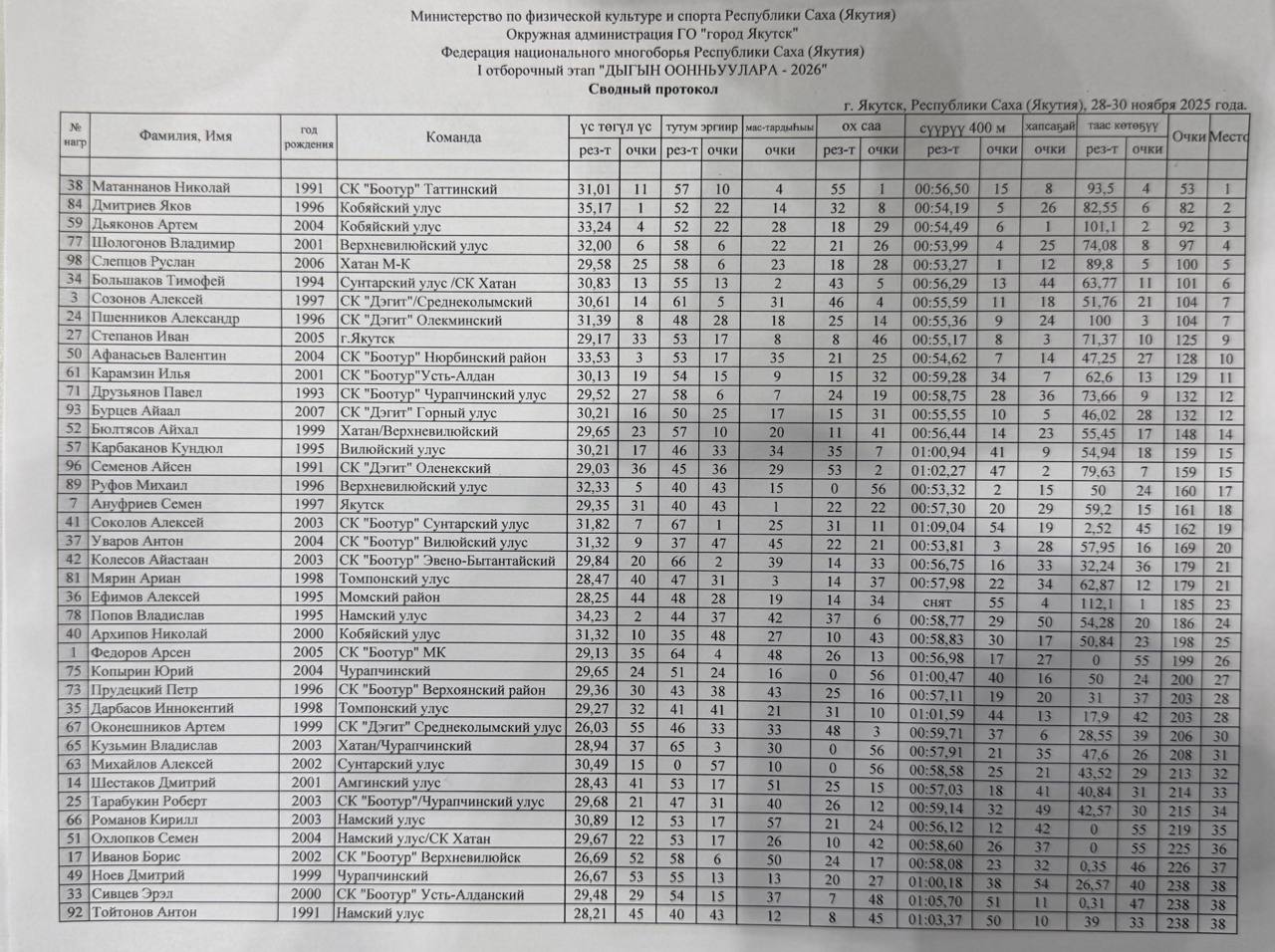 Следующие места заняли Владимир Шологонов – 97, Руслан Слепцов – 100, Тимофей Большаков – 101, Алексей Созонов – 104, Александр Пшенников – 104, Иван Степанов – 125, Валентин Афанасьев – 128. Напомним, что победитель Игр Дыгына-2026 получит однокомнатную квартиру и 3 миллиона рублей.