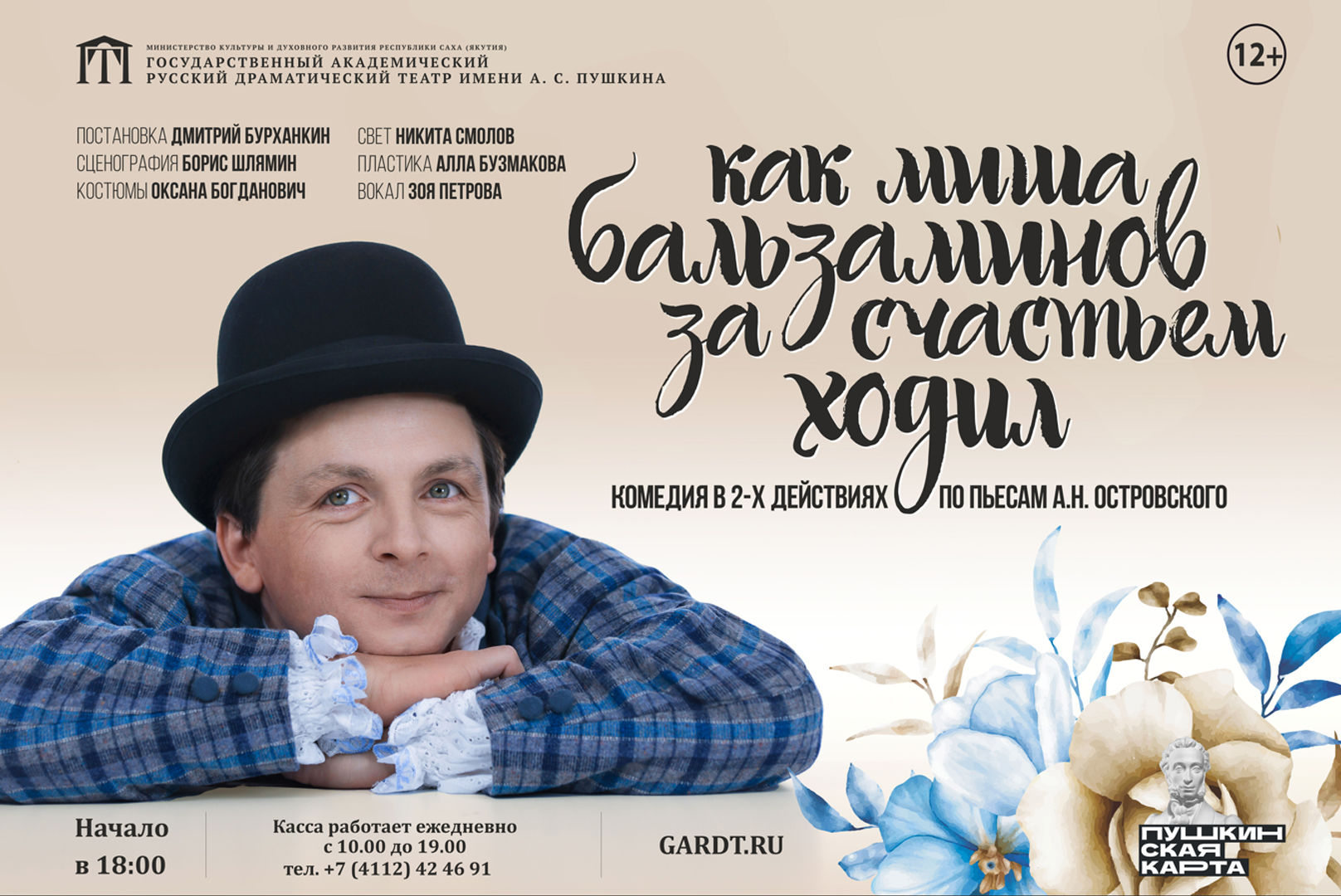 В этот день в Русском театре сыграют трогательную историю маленького человека Миши Бальзаминова в постановке Дмитрия Бурханкина — «Как Миша Бальзаминов за счастьем ходил» (12+) по трем известным пьесам Александра Островского, сообщает пресс-служба ГАРДТ.