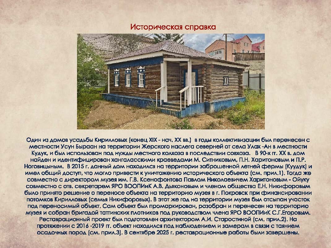 В 90-х годах писатель и директор Покровского музея Павел Харитонов и краевед Прокопий Ноговицын нашли в местности Кудук у Техтюра один из домов с зимника (кыстыка) Кирилловых. В 2015 году благодаря финансированию Никифоровых его отреставрировали и перевезли за дом-музей Серго Орджоникидзе в Покровске. На днях состоялось его открытие. Это был дом для переговоров – светлый, со множеством окон. У него было два входа, один для истопника, который топил большую печь. Кстати, в 90-х годах в Анабарском улусе нашли родовой серебряный пояс улусных голов Кирилловых.