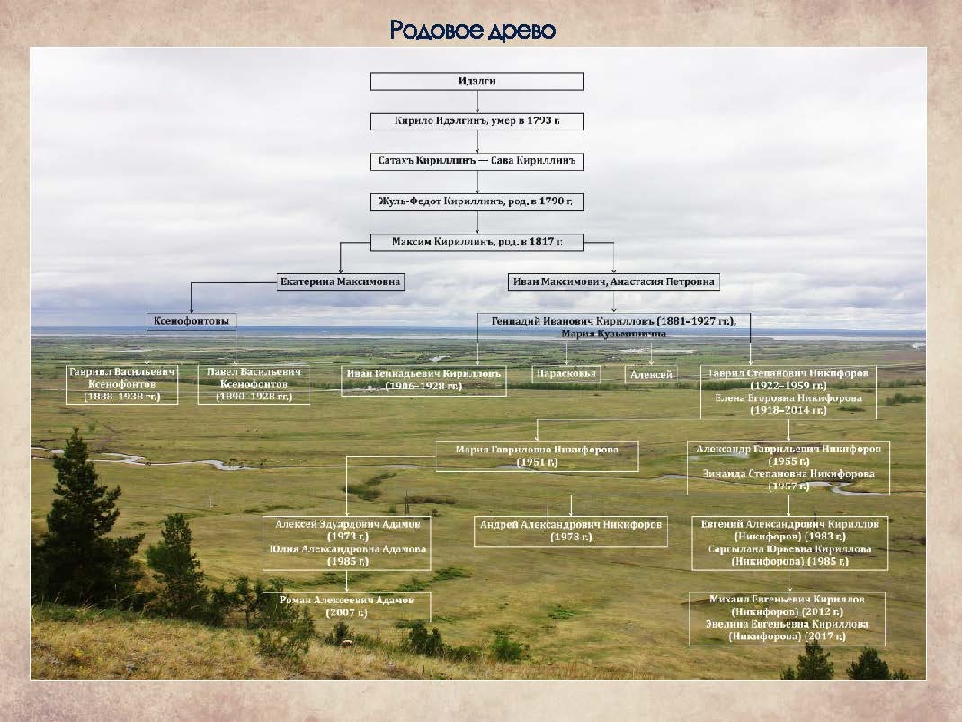 Александр Гаврильевич Никифоров работал геологом и сейчас трудится начальником отдела экспертизы драгметаллов Гохрана Якутии. Женат на Зинаиде Степановне Никифоровой (Томской), докторе геолого-минералогических наук. Их старший сын Андрей окончил МЭИ имени Плеханова, кандидат экономических наук. Сын Марии Гаврильевны Алексей Эдуардович Адамов трудится на высоком посту в Новосибирске. Евгений Александрович Никифоров – предприниматель. Именно он активный инициатор изучения истории семьи. В прошлом году Евгений нашёл у Усун Быраана родовое кладбище и могильный памятник Анастасии Петровны Кириллиной, матери Геннадия Ивановича Кириллова. Кстати, говорят, что его расстреляли в Якутске, но тело, по некоторым данным, тайно перевезли именно сюда. Там работали эксперты, и погост можно восстановить.