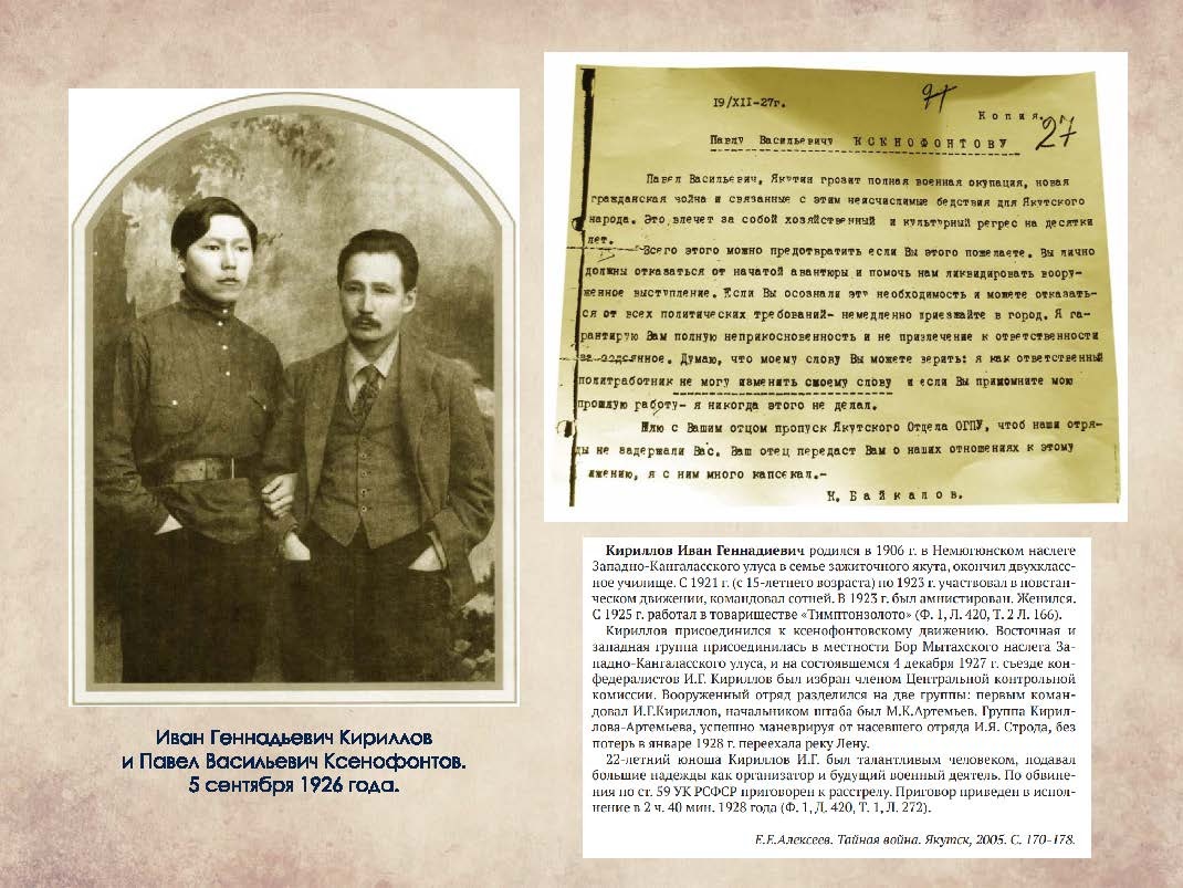 Иван Геннадьевич с 15 лет в 1921 году ушёл в отряд Дмитриева и воевал с красными. Вскоре уже командовал сотней. В 1923 году был амнистирован, женился на Анне Семёновне Барашковой, но в 1927 году ушёл к брату Павлу Ксенофонтову. Иван командовал отрядом конфедералистов, где у него начальником штаба был М.К. Артемьев. Был расстрелян, как и отец, который помогал его отряду продуктами и оружием.