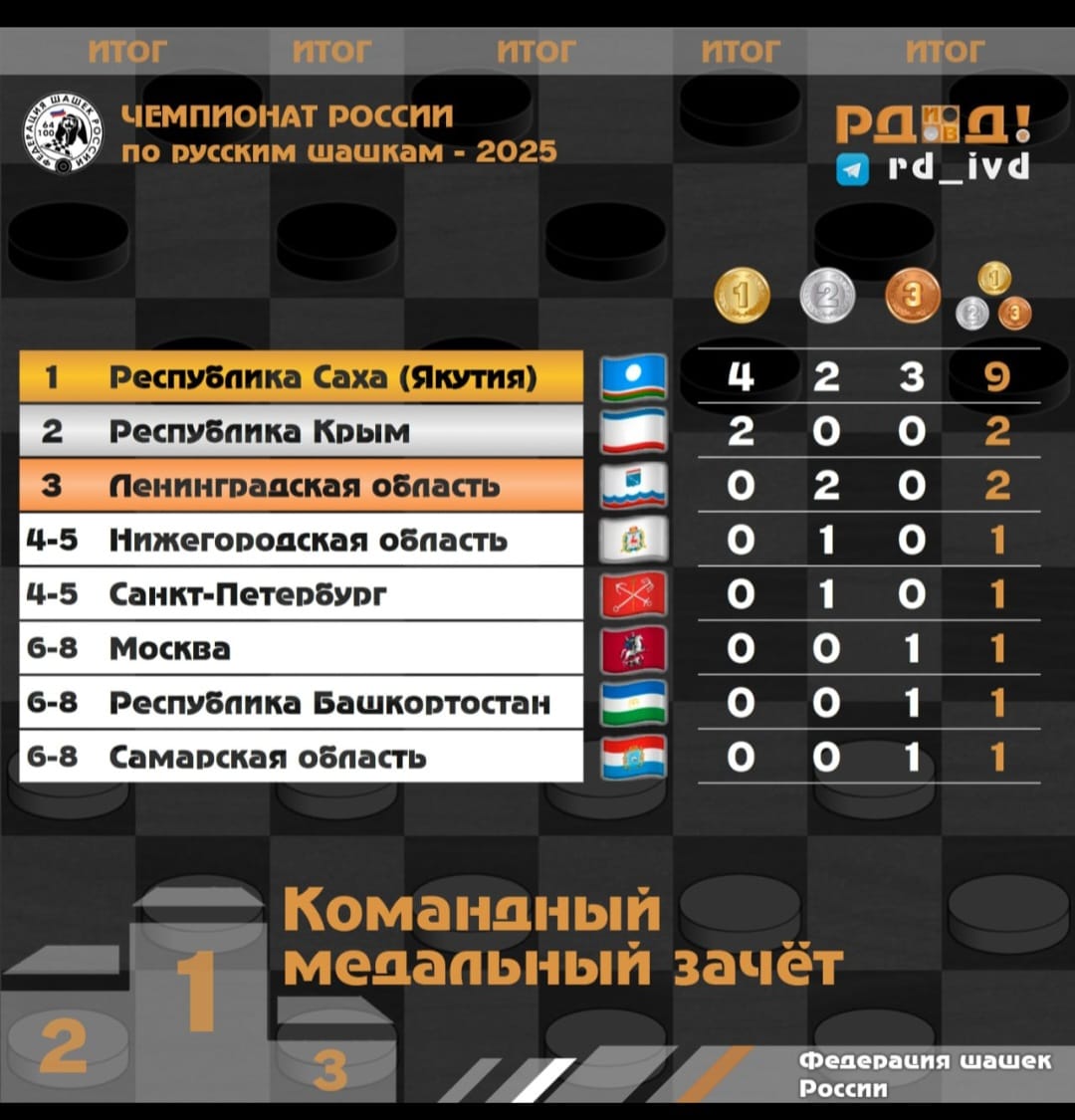 В быстрых шашках победил 12-кратный чемпион мира Гаврил Колесов. На счету Дайааны Кондратьевой три медали – серебро и две бронзы. Чемпионат России является отборочным на чемпионат мира по русским шашкам 2026 года.