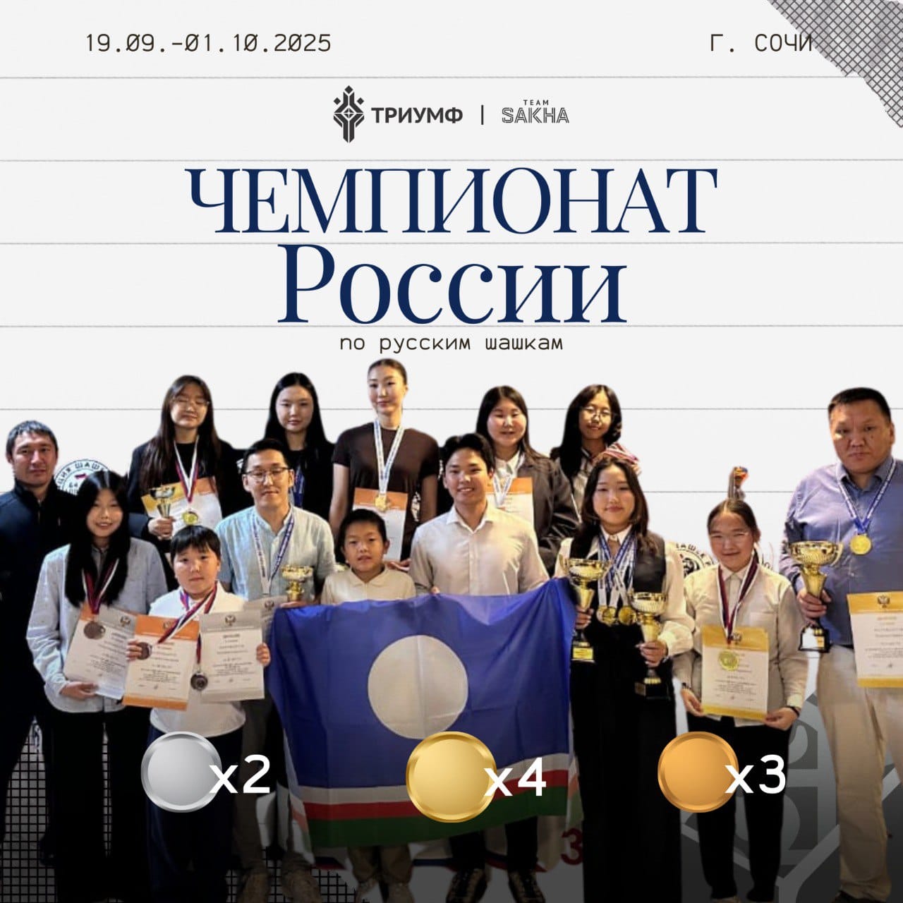 В Сочи завершился чемпионат России по русским шашкам. Сборная Якутии завоевала девять медалей, четыре из которых — золотые. Особенно отличилась Сандаара Апросимова, оформившая золотой хет-трик: она выиграла турниры по классическим, быстрым и молниеносным шашкам. Причём победу в классике она вырвала в последнем туре.