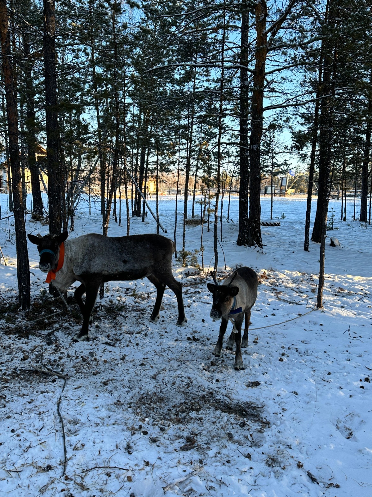 И вот настал момент встречи с северными оленями. Мы их застали привязанными к деревьям.
