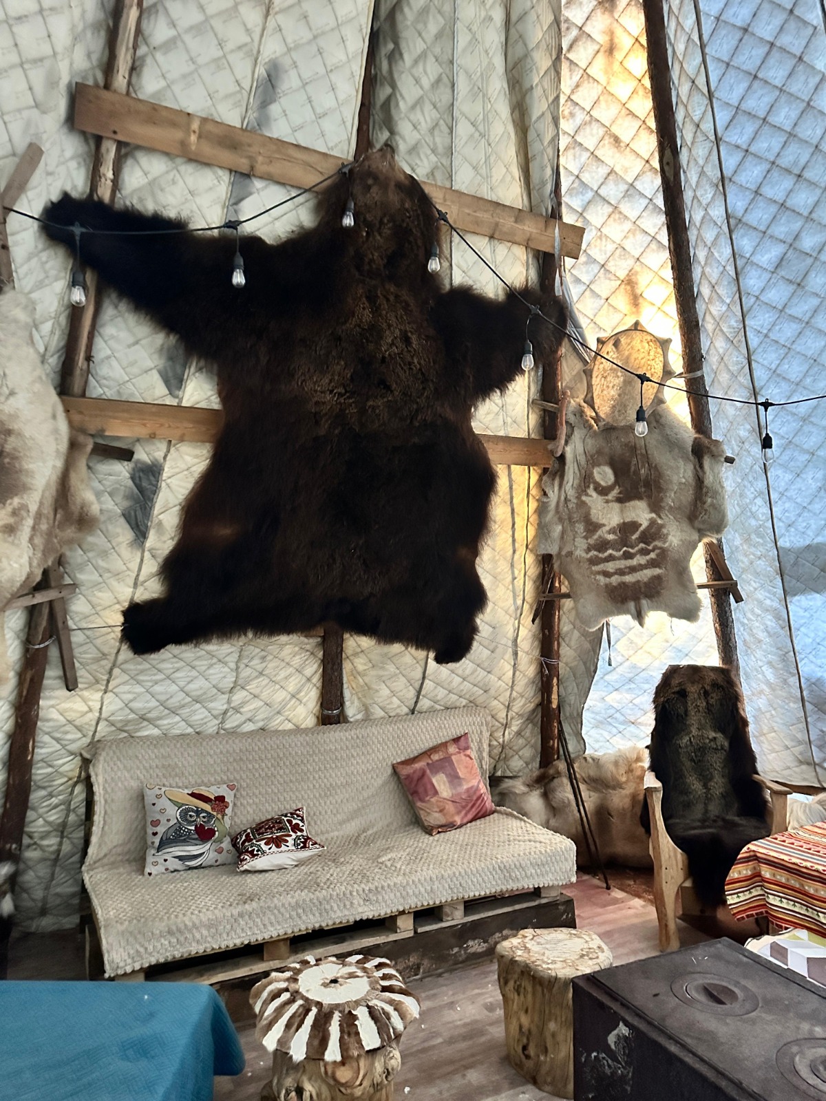 Вообще ураса – это летнее жилище, но Раиса покрыла ее утепленным материалом, внутри стоит печка, на стенах шкуры медведя и оленей, так что, как она говорит, здесь можно переночевать и зимой. В палатках также тепло, когда топишь «буржуйку». Все довольно аскетично, но под треск печи становится очень уютно.
