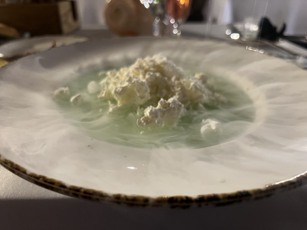 В финале ужина подали мороженое «Зимняя Лена». Сливочный десерт получился в виде хлопьев снега, словно они только что упали с неба. Схожести добавляло основание из голубого желе, по которому стекали с тарелки клубы холодного тумана. Дмитрий Лунёв посоветовал подождать и с осторожностью пробовать охлажденное до температуры замерзание азота (-210 ˚С) угощение, но не все последовали его совету – и было понятно почему.