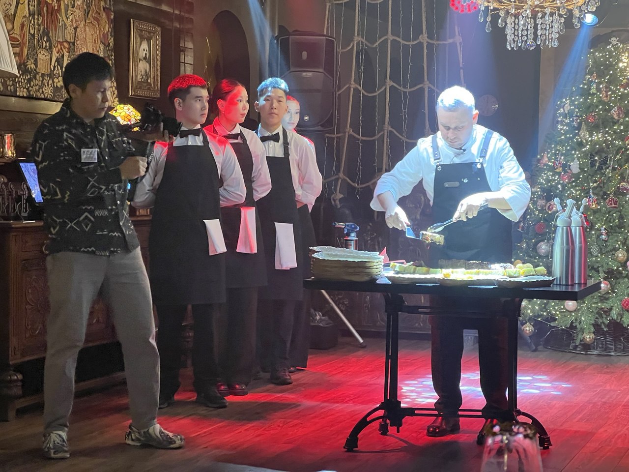 После летнего салата наступило время основного блюда – на «горячее» подали «Жеребятину в огне» и она действительно горела, подожженная шеф-поваром, пока он нарезал порционные куски. Как пояснил Дмитрий Лунёв, он выбрал этот вид мяса, потому что, по его мнению, оно наиболее отражает вкус Якутии. И действительно – жеребятину едят только в нашей республике, специально выращивая для этого поголовье лошадей, свободно пасущихся на природе и не знающих никакого труда.