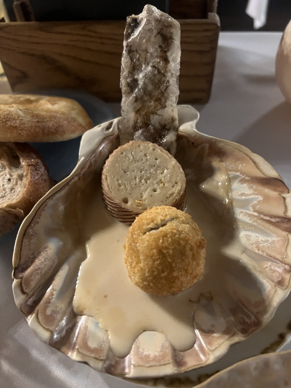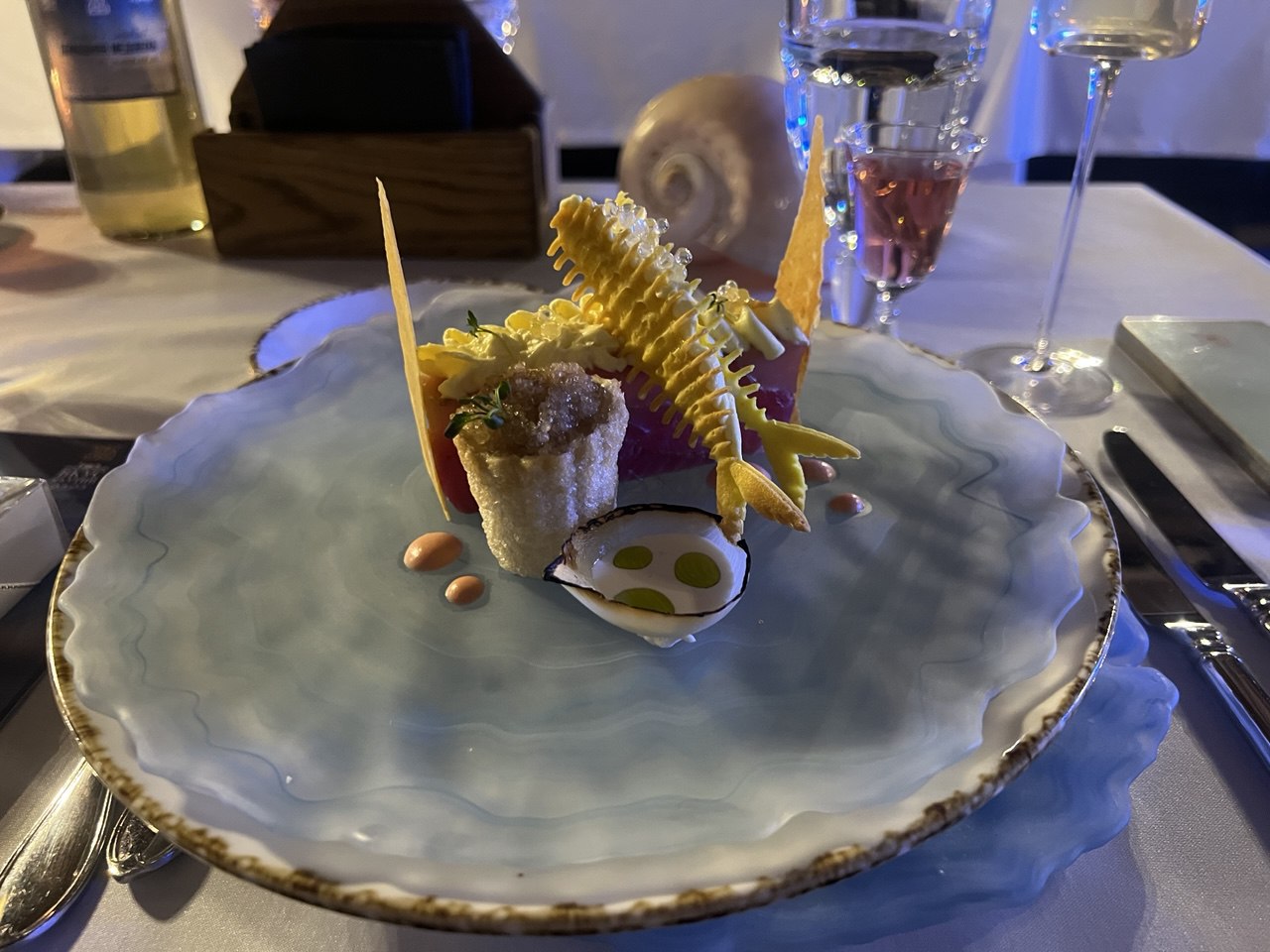 Осень являла горячая закуска «Жемчужина Якутии» — её подали на тарелке в форме створки раковины и блюдо действительно украшала жемчужина, выполненная из… филе карася. Как, впрочем, и всё на тарелке – например, суфле из карасиного мяса, обернутое пластиной из него же так, что он стал похож на отрезанный кусок традиционной якутской кровяной колбасы «хаан». И шарик красиного паштета. И даже полупрозрачное то ли опахало, то ли намёк на парус – было изготовлено из особым способом обработанной карасиной шкурки. Такой замысел шеф-повар объяснил традицией якутского народа осенью по первому льду проводить массовую рыбалку мунха – когда на озеро выходит множество людей, чтобы загнать косяки карася в продернутый подо льдом большой невод.