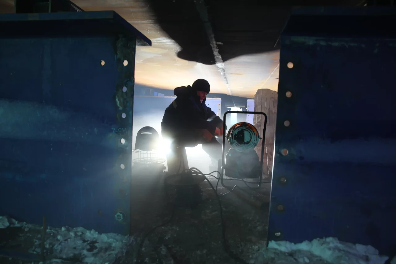 Как отметил главный инженер ООО «ВИС Строй» Михаил Самарчев, строительство Ленского моста продолжается и в зимний период, при критически низких температурах. «Работы ведутся в специализированных технологических укрытиях, в которых создаётся положительная температура воздуха и не нарушаются условия производства работ. Соответственно, сварочный режим и режим труда рабочих полностью обеспечены, технологический процесс налажен. Уже началась укрупнительная сборка девятого коффердама непосредственно в месте его установки и спуска в акваторию. Также в настоящее время выполняются работы по устройству ледовой переправы с левого на правый берег для обеспечения логистики и доставки материалов. Завершён цикл работ по устройству выравнивающего слоя, далее ведётся намораживание дополнительного слоя усиления для увеличения грузоподъёмности, необходимой для работы строительной техники. Кроме того, ведутся работы по изготовлению арматурных каркасов на специализированном навивочном станке, который позволяет сократить трудозатраты и увеличить производительность. Безусловно, низкие температуры вносят свои ограничения: требуется применение специализированных технологических укрытий, систем подогрева, а также особых методов эксплуатации строительной техники. Однако при строгом соблюдении всех требований и технологий производства работ в зимних условиях обеспечивается полное качество и полный цикл строительно-монтажных работ», — отметил он.