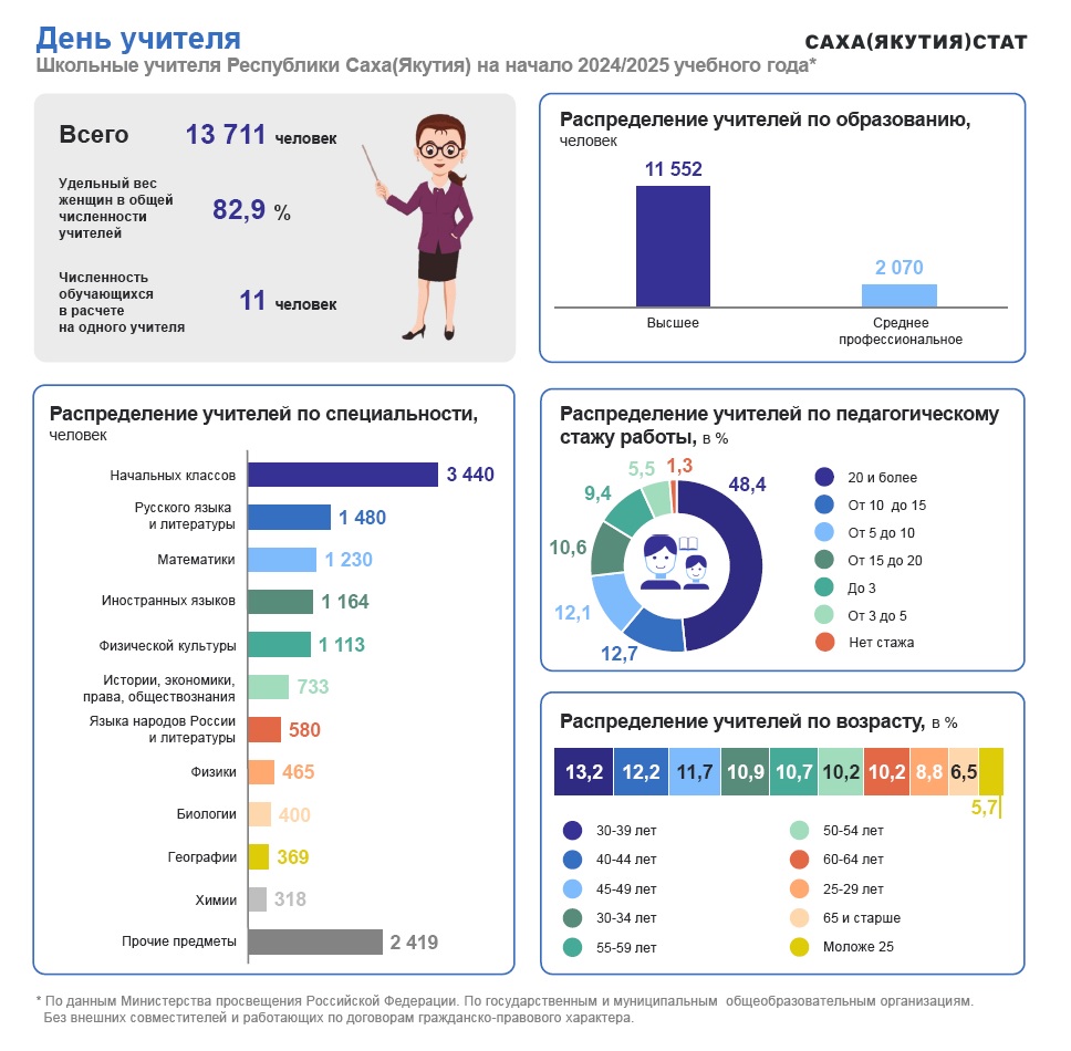 По данным Министерства просвещения России, на начало 2024/2025 учебного года в 622 государственных и муниципальных общеобразовательных учебных заведениях Якутии работали 13711 учителей, из них 82,9% — женщины. В среднем на одного учителя приходилось 11 учеников.