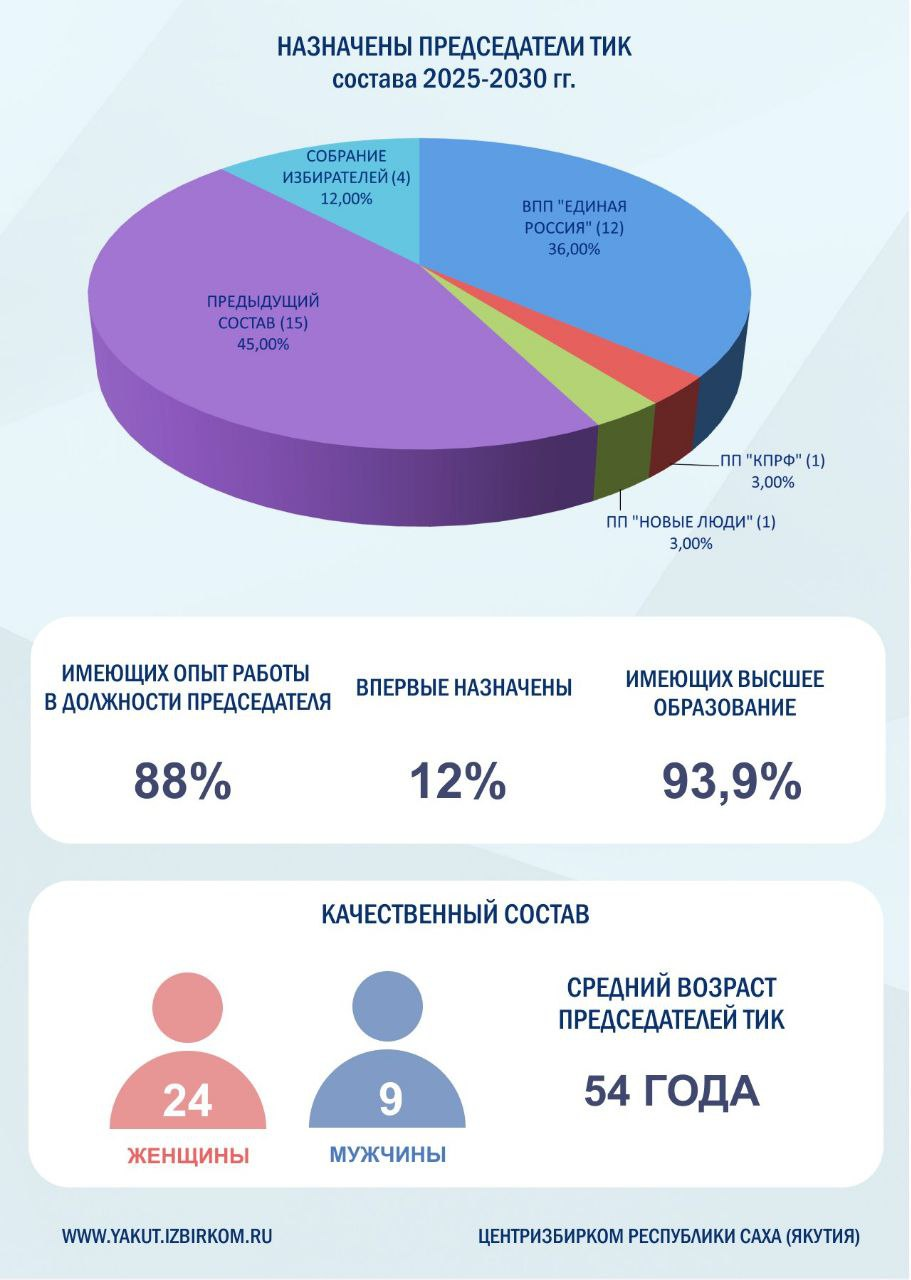Члены Центризбиркома Якутии назначили председателей 33-х новых ТИК. При их назначении предпочтение отдавалось кандидатурам, имеющим опыт работы в избирательных комиссиях, в том числе в должности председателей. Впервые на должность назначены руководители четырёх комиссий: Верхневилюйской, Намской, Среднеколымской и Эвено-Бытантайской. Остальные 29 председателей ТИК были переназначены. В Центризбиркоме отметили, что все 33 руководителя имеют опыт работы в избирательной системе.