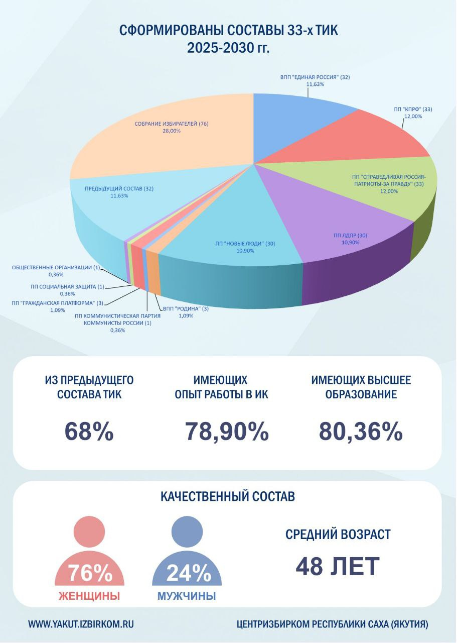 Из числа членов предыдущих ТИК, работавших в 2020–2025 годах, в новые составы перешли (назначены) 186 человек или 68% от общего числа. Таким образом, ТИК обновились на 32% или 89 человек. Состав Оленекской ТИК будет обновлён в декабре этого года, а формирование Нерюнгринской ТИК запланировано на июнь 2026 года.