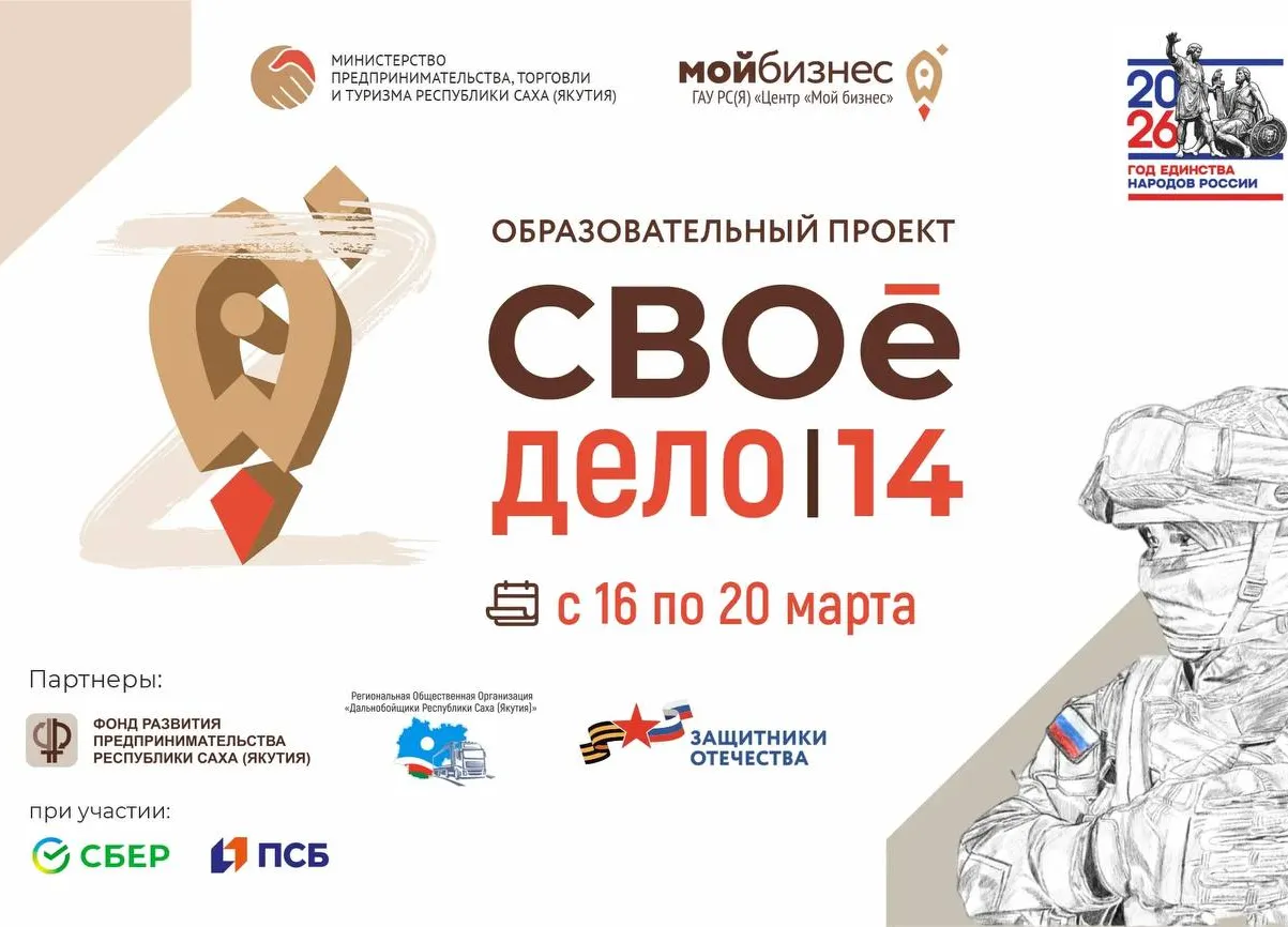 Стартовал приём заявок на образовательную программу «СВОе дело|14», ориентированную на участников специальной военной операции и членов их семей. Проект даёт возможность освоить основы предпринимательства, получить практические знания и поддержку для запуска собственного бизнеса в Республике Саха (Якутия).
