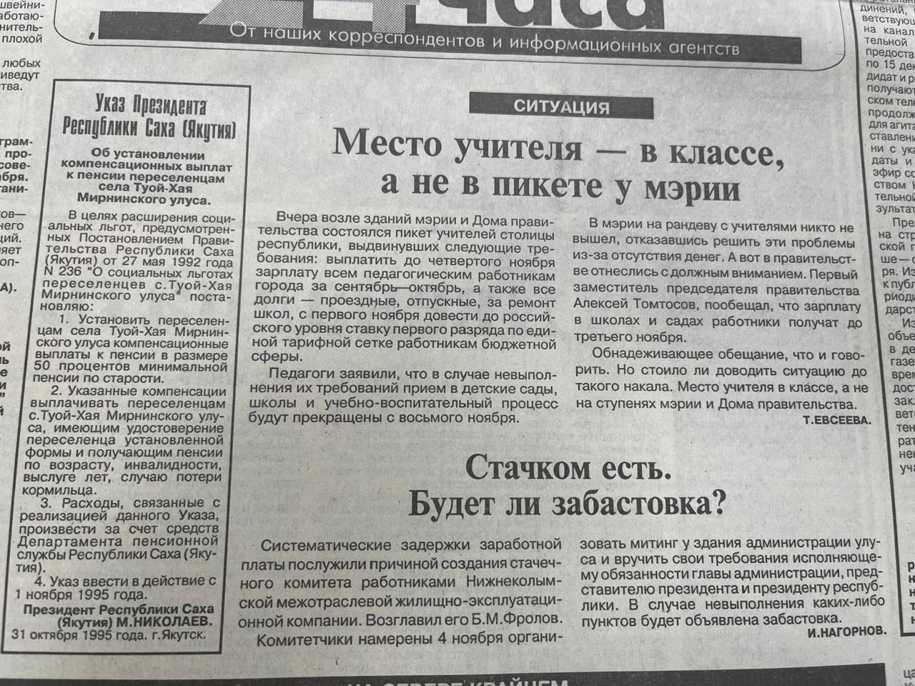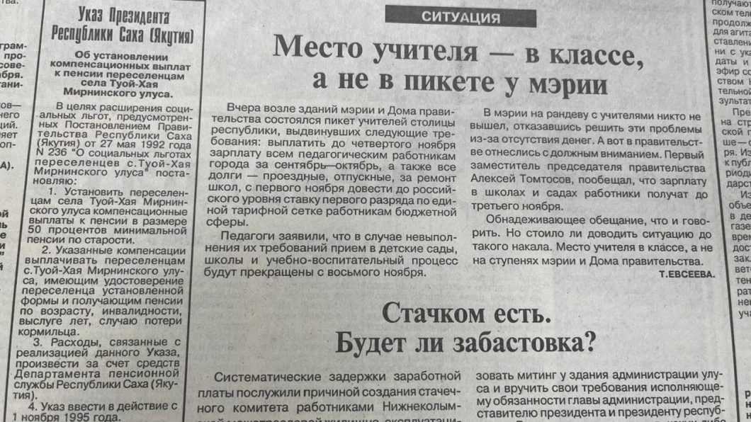 Мы продолжаем серию публикаций статей из газет 30-летней давности. Сегодня в очереди — заметка от 2 ноября 1995 года о пикете учителей перед зданием мэрии и Домом правительства с угрозой забастовки. Педагоги взбунтовались, потому что несколько месяцев не получали зарплату.