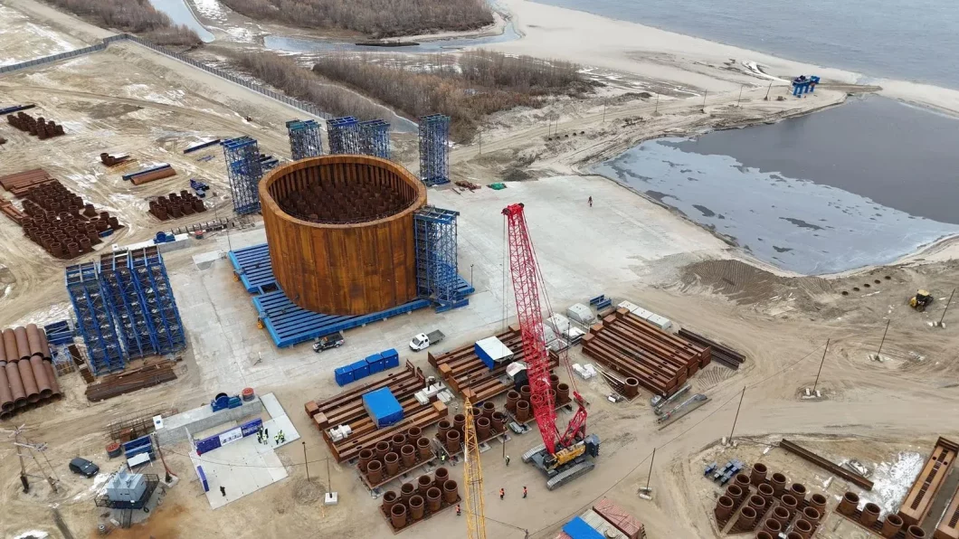 Завершена сборка первого коффердама – большого цилиндра шириной до 40 метров и высотой 18 метров. Уникальная технология предполагает доставку собранного цилиндра баржами и его установку на дно реки для создания сухого пространства, что позволяет строителям работать в обычных условиях на дне водоема. Всего коффердамов будет три — каждый установят под пилон будущего моста. Вывод в русло реки намечен на июнь 2026 года, сразу после ледохода. Подобный метод при строительстве мостовых сооружений применяется в российской практике впервые.