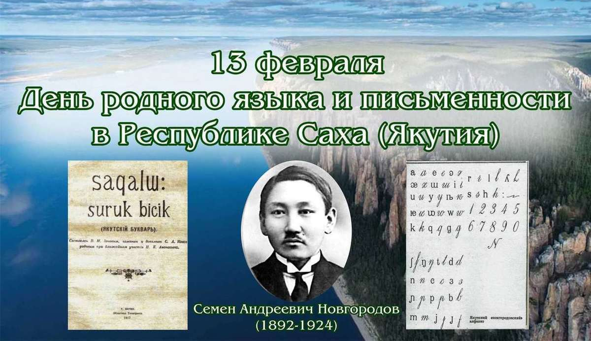 13 февраля в Якутии отмечают День родного языка и письменности, приуроченный ко дню рождения первого якутского ученого-лингвиста, создателя якутской письменности, просветителя Семена Новгородова. В этот день по всей республике стартует тематическая декада, мероприятия которой проходят в рамках Года культуры в регионе и Года единства народов в России, объявленного Президентом РФ Владимиром Путиным.