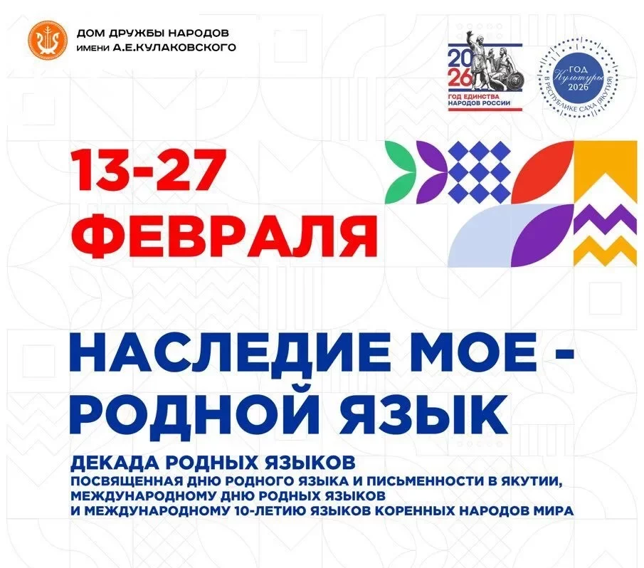 В Якутске, в Доме дружбы народов им. А.Е. Кулаковского с 13 по 27 февраля пройдет Декада родных языков «Наследие мое — родной язык». Мероприятия декады посвящены Дню родного языка и письменности в Якутии, Международному дню родных языков и Международному десятилетию языков коренных народов мира.