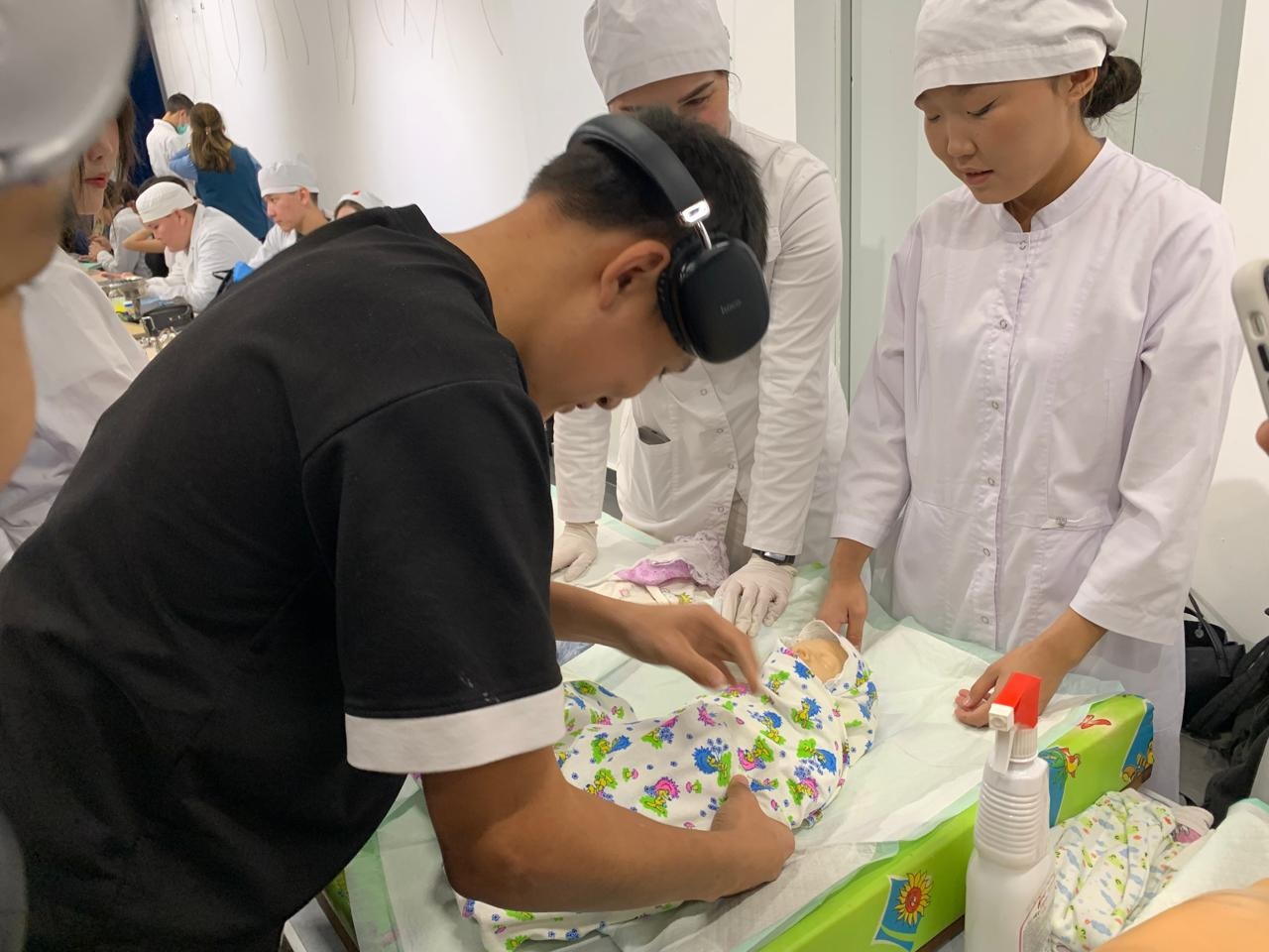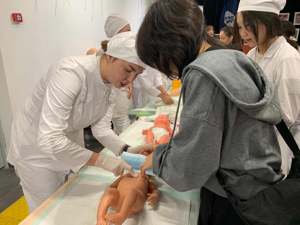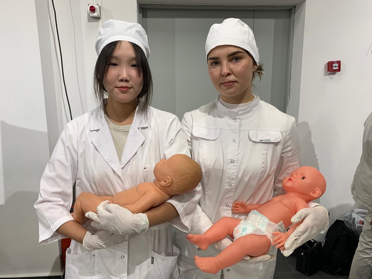 Например, студентка 2 курса Нерюнгринского медколледжа Алеся Юшкова проводила мастер-класс по сердечно-легочной реанимации у новорожденных детей. «Мы показываем последовательность действий, как себя обезопасить и как сделать реанимацию эффективной», — рассказала студентка.