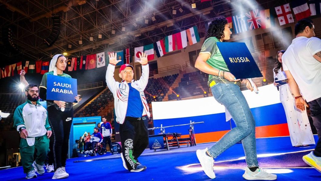 Сборная России вышла с флагом страны на церемонию открытия чемпионата мира по пауэрлифтингу среди спортсменов ПОДА в Каире (Египет). Вы видите на фотографии якутского спортсмена Владимира Балынца.