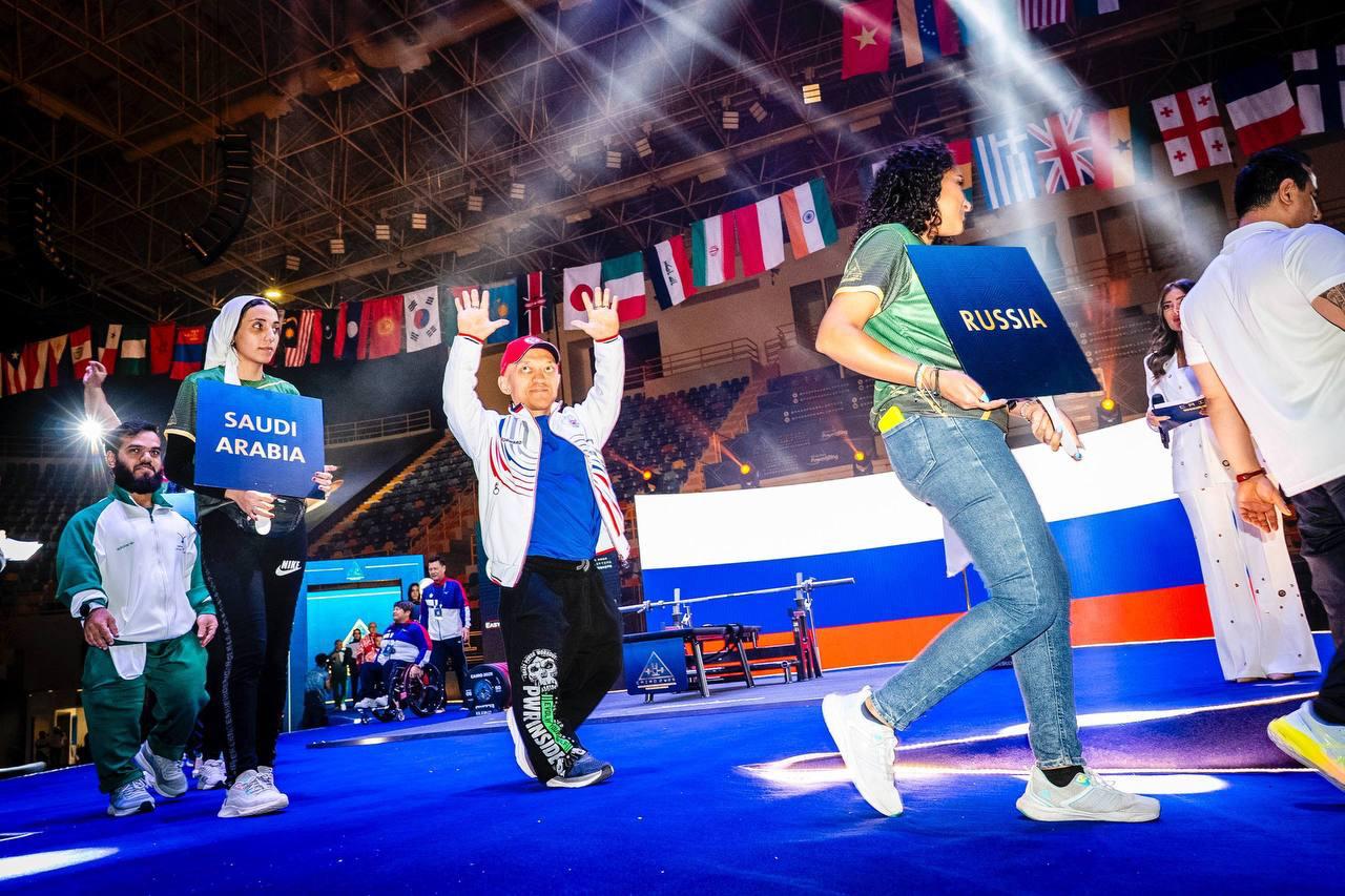 Сборная России вышла с флагом страны на церемонию открытия чемпионата мира по пауэрлифтингу среди спортсменов ПОДА в Каире (Египет). Вы видите на фотографии якутского спортсмена Владимира Балынца.