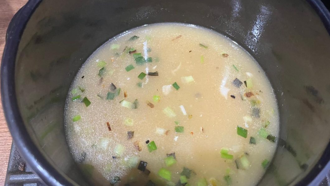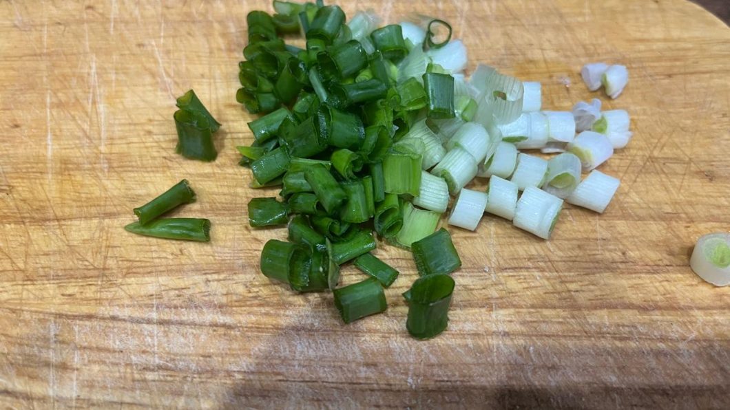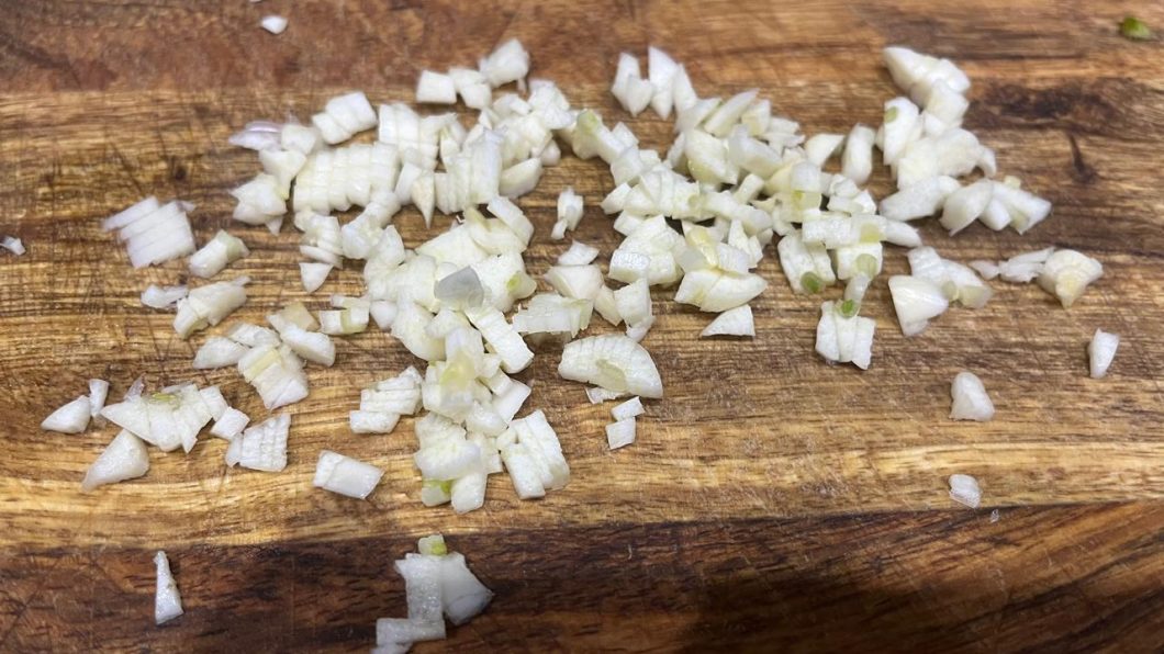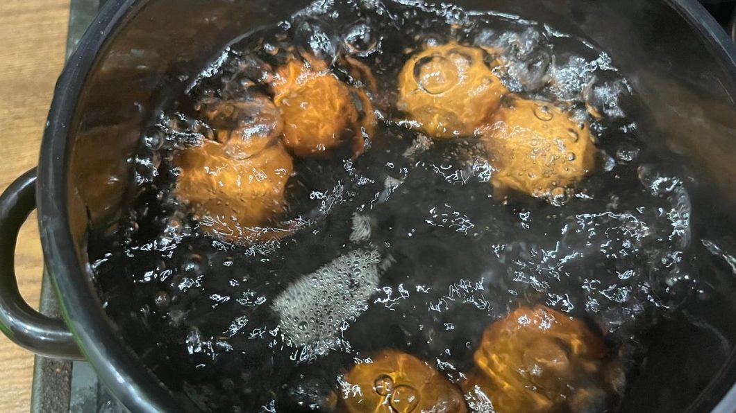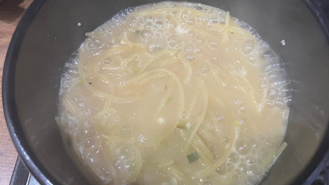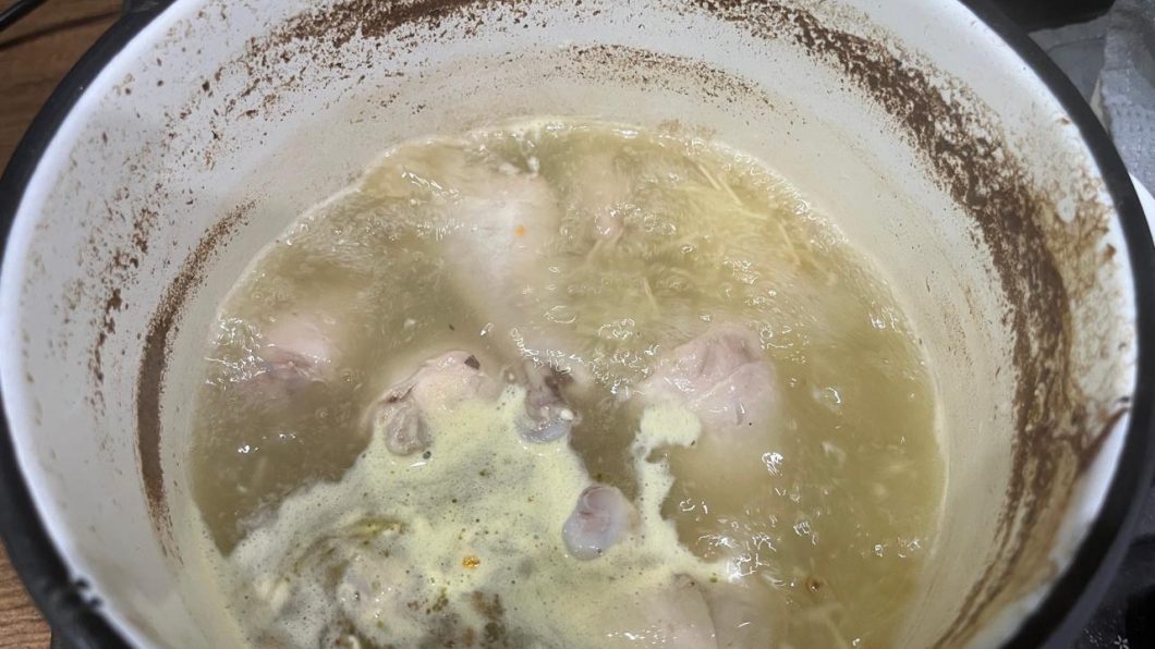 Бульон варится два часа. Так что воды налейте побольше, все равно в процессе выпарится. Мы под конец добавили приправы для куриного супа. Бульон вышел непрозрачным. Но, как мы поняли, это нормально. Если хотите, чтобы отвар оставался прозрачным, томите его на медленном огне и снимайте с поверхности пену по мере приготовления. Далее нарежьте лук и чеснок. Отварите яйца вкрутую. Они понадобятся позже при подаче.