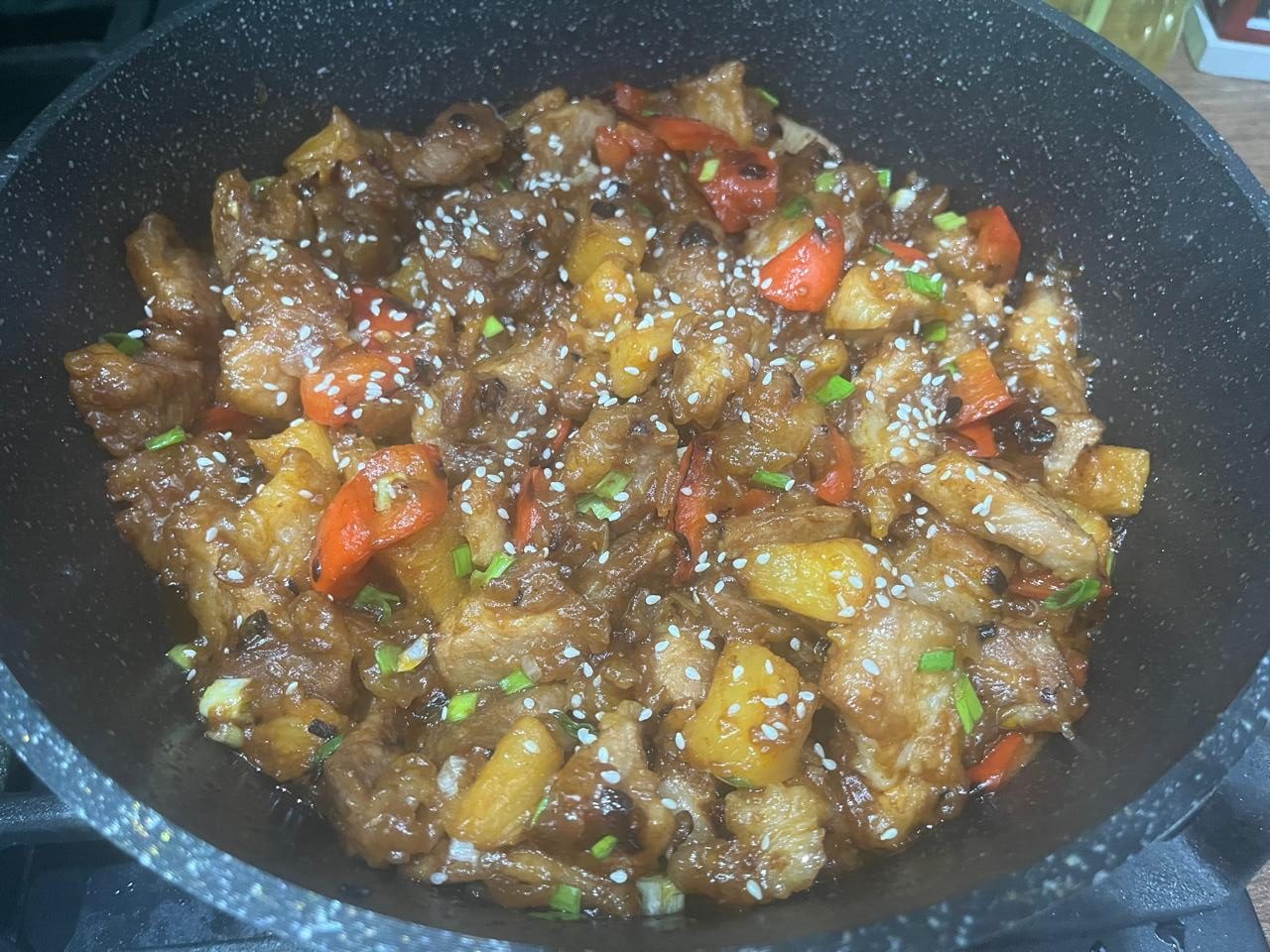 Это китайско-американское блюдо возникло в кантонской кухне в XVIII веке. Оно стало популярным в США после того, как в начале XX века китайские иммигранты приехали в США работать на железной дороге. Обычно подаётся с овощами, нередко — с ананасом. Именно такой, второй вариант мы и предлагаем приготовить.